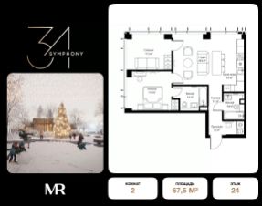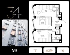 Дом сдан. Ключи в день покупки! В продаже 2-комнатная квартира площадью 59.50 м² с предчистовой отделкой на 37 этаже 43 этажного дома в корпусе Сильвер. ЖК Симфония 34 - концептуально новый жилой комплекс премиум-класса с подземной парковкой, состоит из четырех башен высотой 36 - 54 этажа. Квартиры сдаются с базовой (предчистовой) отделкой MR BASE или дизайнерской чистовой отделкой MR READY. Высота потолков 3 - 6 метров, окна высотой до 2,6 м. Более 100 кладовых в подземной части ЖК и более 500 на этажах. Безопасность - Система контроля входа на территорию комплекса, биометрия - Система автоматического водяного пожаротушения и противопожарного водопровода, система пожарной вентиляции - Доступ на парковку при помощи системы распознавания автомобильных номеров, карточка для контроля доступа резидентов - Система видеонаблюдения - Круглосуточная связь через приложение, телефон, голосовые сообщения с охраной, консьержем, call-центр. Расположение Пешком - 6 минут до метро "Дмитровская" - 15 минут до Тимирязевского парка На машине - 5 минут до Савеловского вокзала и Аэроэкспресса в Шереметьево - 10 минут до Москва-Сити и Садового кольца Благоустройство - 70% территории отведены под зеленые насаждения и ландшафтный дизайн - Приватный Японский сад - Детские площадки с зонированием по возрасту - Clubhouse для резидентов - Wellness & SPA - Зона для пикника, зона с гамаками - Центральное лобби, ресторан, коммерческие помещения - Дополнительный вход/выход на территорию комплекса Окружение - В 10 минутах от Symphony 34 находится дизайн-завод Flacon, где регулярно проходят культурно-образовательные и развлекательные мероприятия - Тимирязевский парк расположен в 850 м. Площадь парка 232 га - Рядом расположен парк "Дубки", площадью 16,5 га. - В 15 минутах расположен Хлебозавод 9. Здесь находятся шоурумы брендов, кафе разных кухонь мира, образовательные проекты и площадки для мероприятиКомпания MR предлагает своим клиентам специальные условия приобретения квартир в рамках программ ипотечного кредитования от банков-партнеров. 2-комнатная квартира с отделкой от застройщика рядом с метро Тимирязевская.