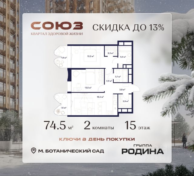 Готовые дома и ключи в день покупки Рассрочка 0% Продаётся 2-комнатная квартира площадью 61.4 м² на 2 этаже в Жилом Комплексе "Союз". Квартал здоровой жизни премиум-класса с рекордным количеством олимпийских видов спорта: - Ледовая арена для хоккея и фигурного катания, - Футбольные поля для тренировок, - Спортивный зал для фехтования, - Бассейн на 6 дорожек, - Центр единоборств, - 4 крытых площадки для настольного тенниса, - 7 теннисных кортов (крытых и открытых), - 4 крытых площадки для сквоша, - Легкоатлетический стадион, - Площадки для баскетбола и волейбола. Уникальные форматы квартир с мастер-спальнями, приватными террасами, балконами, а также пентхаусы с открыточными видами на город. Все квартиры продаются с отделкой Shell&Core и панорамным остеклением. Расположение Пешком: - 2 мин. до парка "Сад Будущего"; - 6 мин. до ст. м. "Ботанический сад"; - 6 мин. до ст. МЦК "Ботанический сад"; - 6 мин. до парка "Леоновская роща"; На автомобиле: - 2 мин. до СВХ (МСД); - 5 мин. до Проспекта Мира; - 10 мин. до ТТК; - 15 мин. до Садового кольца; - 25 мин. до аэропорта "Шереметьево". Благоустройство - собственная спортивная инфраструктура 7 Га; - зона для пикников; - игровые и спортивные площадки для детей всех возрастов; - розарий, а также сосновые, каштановые и дубовые аллеи; - площадки под открытым небом для занятий спортом и йоги; - игровые комнаты для детей; - лаунж-зона для резидентов; - просторная переговорная для деловых встреч; - премиальный ресторан "Шабада" Сосо Павлиашвили с водными арт-объектами на прогулочной аллее, садом ароматных трав и сценой под открытым небом; - кафе, химчистки, аптеки и супермаркеты рядом с домом. Окружение - 8 парков: Сад Будущего, Леоновская роща, Хуамин, Главный ботанический сад РАН, Шереметьевская дубрава, Останкино, парк спорта "Яуза", пойма реки Яуза и музей-усадьба "Останкино"; - 3 ВУЗа: ВГИК, РГСУ, МГПУ; - 12 школ, в том числе: школа 1499 им. И.А. Докукина (топ 100), Brookes Moscow, IThub школа; - 18 детских садов, в том числе билингвальный ALERTUM KIDS; - один из крупнейших океанариумов Европы "Москвариум"; - один из крупнейших в Европе торгово-развлекательных центров "Европолис". Купить 2-комнатную квартиру с отделкой от застройщика рядом с метро ВДНХ.