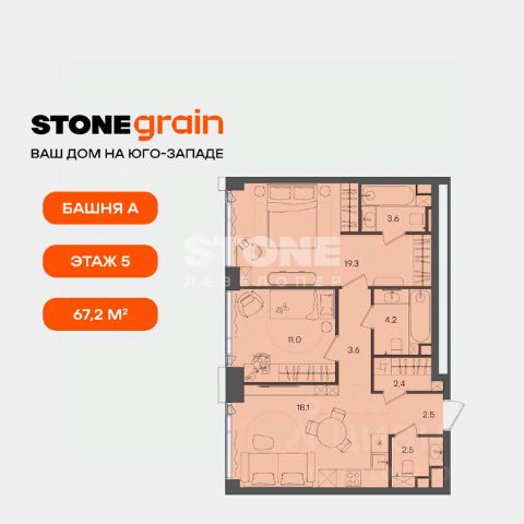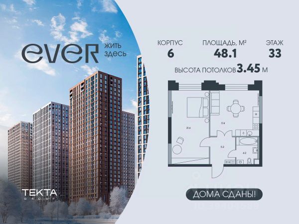 2-комн. квартира в ЖК "Ever" на 4 этаже в 34 этажном здании Корпус 5. Общая площадь: 55.4 кв.м., жилая: 29.5 кв.м. Высота потолков 3.00 м.
