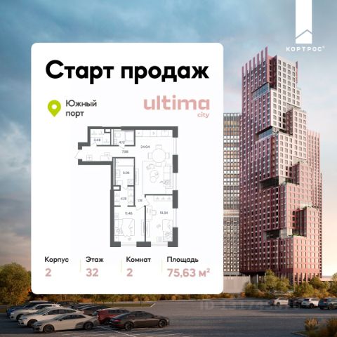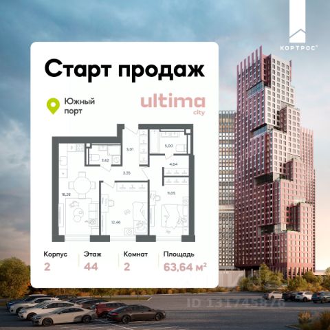 Указанная акционная стоимость доступна при 100% оплате или ипотеке без субсидирования. Цена действует до 31.12.2025 23:49:59. Стоимость без акции 21876400. Старт продаж! Продаётся 2-комнатная квартира от застройщика ГК "КОРТРОС" в жилом комплексе бизнес-класса ULTIMAcity. Квартира расположена на 3 этаже 52 этажного корпуса 2. Общая площадь 48,08 м². Без отделки. В квартире: • Окна на две стороны света • Гардеробная • Два сан. узла ULTIMAcity — жилой комплекс бизнес-класса в перспективном районе на юго-востоке Москвы. На его территории появятся 9 башен на 756 этажей, двухуровневый подземный паркинг, собственная инфраструктура, включая детский сад и школу. Всего девелопер благоустроит территорию в 2,6 га. Ближайшая станция метро — "Южный порт". Она откроется в 2028 году и будет находиться в 2-х минутах ходьбы. А прямо напротив расположится остановка водного автобуса-электрохода "Синичка". Дорога от квартала будет удобна и для автомобилистов: - до Кремля — 12 км - до МКАД — 12 км - до выезда на ТТК — 3 км - до Садового кольца — 8 км В двух корпусах первой очереди ULTIMAcity этажностью 45 и 52 реализуется 1 079 квартир с продуманными, рациональными планировочными решениями. В ассортиментной линейке представлены однокомнатные квартиры от 28,2 до 61 кв. м, двухкомнатные лоты от 44,3 до 95,4 кв. м, квартиры с тремя (71 — 115,57 кв. м) и четырьмя спальнями (106,6 — 114,97 кв. м). В экспозиции также есть квартиры с террасами, лоджиями, тремя и четырьмя санузлами, а также с функциональными нишами-кладовыми на кухнях. Запроектированы и эксклюзивные двухуровневые резиденции со вторым светом, в том числе с видом на Москву-реку, площадью от 77,7 до 141,9 кв. м. В рамках проекта запланировано строительство 9 корпусов, школы на 500 учащихся и детского сада на 225 мест. Еще будет создана продуманная инфраструктура для жителей: детские и спортивные площадки, амфитеатр для мероприятий, беседки и теплицы для садоводства, коворкинг, детский клуб и ресторан с открытой террасой. Доступ в жилой комплекс осуществляется по биометрическому контролю - Face ID. Вокруг квартала будет приватная территория с видеонаблюдением и консьерж-сервисом 24/7. Лобби корпусов будут иметь двойные выходы: на улицу и во внутренний закрытый двор.