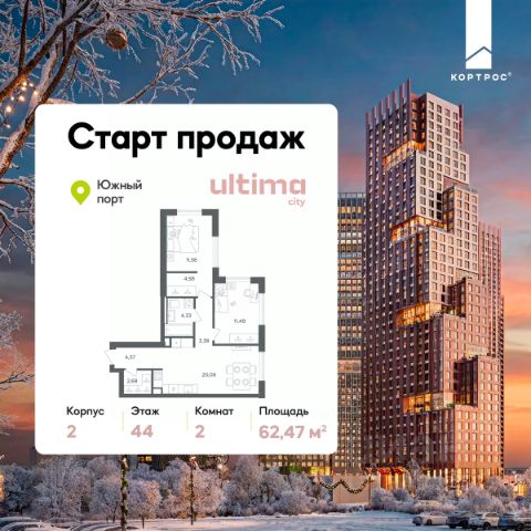 Указанная акционная стоимость доступна при 100% оплате или ипотеке без субсидирования. Цена действует до 31.01.2026 23:58:59. Стоимость без акции 27526630. Старт продаж! Продаётся 2-комнатная квартира от застройщика ГК "КОРТРОС" в жилом комплексе бизнес-класса ULTIMAcity. Квартира расположена на 3 этаже 52 этажного корпуса 2. Общая площадь 62,99 м². Без отделки. В квартире: • Мастер-спальня • Гардеробная • Два сан. узла ULTIMAcity — жилой комплекс бизнес-класса в перспективном районе на юго-востоке Москвы. На его территории появятся 9 башен на 756 этажей, двухуровневый подземный паркинг, собственная инфраструктура, включая детский сад и школу. Всего девелопер благоустроит территорию в 2,6 га. Ближайшая станция метро — "Южный порт". Она откроется в 2028 году и будет находиться в 2-х минутах ходьбы. А прямо напротив расположится остановка водного автобуса-электрохода "Синичка". Дорога от квартала будет удобна и для автомобилистов: - до Кремля — 12 км - до МКАД — 12 км - до выезда на ТТК — 3 км - до Садового кольца — 8 км В двух корпусах первой очереди ULTIMAcity этажностью 45 и 52 реализуется 1 079 квартир с продуманными, рациональными планировочными решениями. В ассортиментной линейке представлены однокомнатные квартиры от 28,2 до 61 кв. м, двухкомнатные лоты от 44,3 до 95,4 кв. м, квартиры с тремя (71 — 115,57 кв. м) и четырьмя спальнями (106,6 — 114,97 кв. м). В экспозиции также есть квартиры с террасами, лоджиями, тремя и четырьмя санузлами, а также с функциональными нишами-кладовыми на кухнях. Запроектированы и эксклюзивные двухуровневые резиденции со вторым светом, в том числе с видом на Москву-реку, площадью от 77,7 до 141,9 кв. м. В рамках проекта запланировано строительство 9 корпусов, школы на 500 учащихся и детского сада на 225 мест. Еще будет создана продуманная инфраструктура для жителей: детские и спортивные площадки, амфитеатр для мероприятий, беседки и теплицы для садоводства, коворкинг, детский клуб и ресторан с открытой террасой. Доступ в жилой комплекс осуществляется по биометрическому контролю - Face ID. Вокруг квартала будет приватная территория с видеонаблюдением и консьерж-сервисом 24/7. Лобби корпусов будут иметь двойные выходы: на улицу и во внутренний закрытый двор.