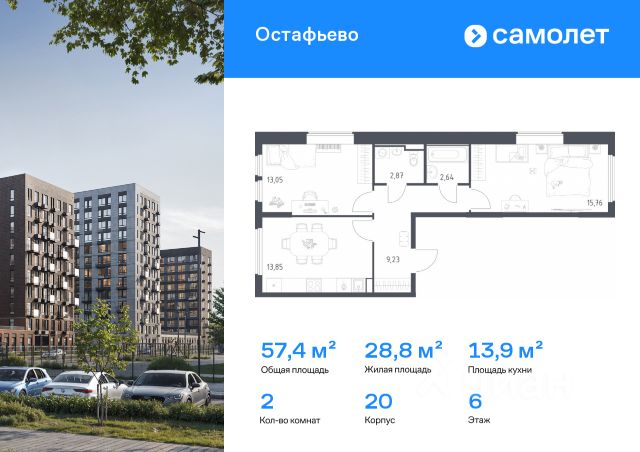 Строим кварталы для жизни с заботой о будущем. Предлагается 2-комнатная квартира комфорт-класса 55,61 кв.м в корпусе 20 на 3 этаже, в ЖК "Остафьево" Квартира с чистовой отделкой. Доступность дополнительных опций уточняйте у застройщика. Приобрести квартиру возможно по специальным акциям от застройщика, с текущими условиями акций можно ознакомиться в блоке "Акций". Цена динамическая и может отличаться, уточняйте актуальность у застройщика. "Остафьево" — масштабный жилой комплекс в Новой Москве, рядом с одноименным музеем-усадьбой и городским парком "Барыши". До станций МЦД "Щербинка" и "Остафьево" можно добраться на автомобиле за 57 минут. Часть домов уже сдана, на территории открыты две школы и три детских сада, а в будущем будет построена поликлиника, ТЦ, еще одна школа и три детских сада. Все необходимое рядом: на первых этажах домов работают магазины, аптеки и кафе. Дворы — приватные мини-парки без машин и посторонних. Кроме игровых площадок, для детей обустроили тематический плейхаб "Маяк". В будущем появятся плейхаб "Алиса в стране чудес", арт-объект "Тропа зеркал", а также большой ландшафтный парк. В квартале — монолитные дома комфортной высоты, от 10 этажей. Светлые фасады украшают кирпичные вставки в теплых природных оттенках.