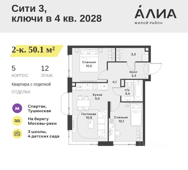 Продаётся 2-комнатная квартира 49.8 м². В жилом районе Алиа на 7-м этаже 28-этажного дома. Жилой район Алиа — это дома бизнес-класса у слияния Москвы-реки и Сходни. Алиа находится в Покровском-Стрешневе, экологически чистом районе на престижном северо-западе столицы. Район возводится на бывшей территории Тушинского аэрополя, где никогда не было промышленного производства. Алиа — это район разностороннего развития, спроектированный по принципу WORK.LIVE.PLAY.LEARN. Это "15-минутный город", где вся необходимая для комфортной жизни инфраструктура — на расстоянии приятной прогулки. У района удобное расположение: отсюда меньше 10 минут пешком до станций метро "Спартак" и "Тушинская" и всего полчаса на автомобиле до центра города или аэропорта Шереметьево. Архитектурную концепцию Алиа разработало бюро SOM (Skidmore, Owings & Merrill), авторы знаменитой "Бурдж-Халифа". В Алиа больше 140 планировочных решений, среди которых — редкие для Москвы форматы: квартиры с окном в ванной, пентхаус, сити-юниты и таунхаусы. Почти половина территории района отдана под благоустройство. В Алиа три парка: Линейный парк с кафе и магазинами, Центральный парк с амфитеатром, сухим фонтаном и большим плейхабом для детей всех возрастов и Прибрежный парк на собственной набережной, одной из самых длинных в Москве. В каждом урбан-блоке — закрытый внутренний двор с гипоаллергенными растениями и детской площадкой. В лобби каждого жилого корпуса в Алиа оборудована зона ожидания, колясочная, гостевой санузел и лапомойка для домашних животных. За стойкой ресепшена резидентов и их гостей встречает консьерж. Центральное лобби урбан-блока — это стильное общественное пространство с коворкингом, лаундж-зоной и кофе-пойнтом. Это "вторая гостиная" жителей урбан-блока и одно из мест, где формируется комьюнити Алиа. Два ключевых объекта инфраструктуры в Алиа — это спорткомплекс "Чкалов Арена", где представлены 25 видов спорта, и самый большой в стране бизнес-парк класса A, благодаря которому району обеспечено быстрое развитие.