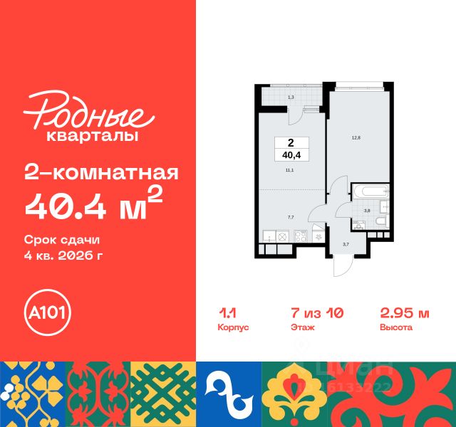 Продается двухкомнатная квартира 233 в новостройке Жилой район "Родные кварталы" по адресу Москва, ТиНАО, Новомосковский АО, Марушкинское С/П, жилой комплекс Родные Кварталы, 1.2, район Внуково, Новомосковский административный округ, Москва. Общая площадь квартиры - 42.70 кв. м., этаж 7 из 9, секция 4. Тип проекта, по которому построен дом - монолит, компания-застройщик - ООО "А101". Стоимость квартиры - 11856082 Р. Срок сдачи - 4 квартал 2026. ПРЕДЛОЖЕНИЯ ОТ ЗАСТРОЙЩИКА В НОЯБРЕ 2025: Ипотека от 13,9 % для всех! На весь срок. "Семейная ипотека" вернулась. Ставка от 3,5 % на весь срок! Без удорожания! Выгодное ипотечное комбо: Ипотека от 2200 р./мес. и от 6 % после рождения ребёнка! Ипотека для всех "Держи пять!" - ставка 5 % на 2 года! *более подробную информацию по скидкам и акциям уточняйте в отделе продаж ЖК "Родные кварталы" строится в экологически благоприятной локации, рядом с парком Изварино и Ульяновским лесопарком. До станции метро "Аэропорт Внуково" и МЦД "Толстопальцево" - 15 мин. на транспорте. До Боровского, Киевского, Минского шоссе - 3, 6 и 20 минут соответственно Основная концепция благоустройства - воссоздание колорита разных регионов России. Этот же принцип использован в благоустройстве и озеленении района от бюро GAFA. Лесопарк, зоны отдыха, пешеходный бульвар со спуском в виде амфитеатра к набережной и центральной торговой площади, спортивные площадки. В шаговой доступности откроются детские сады и школа, поликлиника. На первых этажах домов - спортклубы, клиники, аптеки, супермаркеты, кафе и многое другое. Цветовые решения лобби также созвучны климатическим зонам России. Здесь появятся зоны ожидания с гостевыми санузлами и колясочными. Предусмотрены подземные паркинги и кладовые. Преимущества "Родных кварталов" - уютная атмосфера "малой родины" - полноценная инфраструктура внутри района - выезд на ключевые шоссе - от 3 минут на автомобиле - малоэтажная застройка Продам 2-комнатную квартиру в новостройке с отделкой в поселении Марушкинское в Москве.
