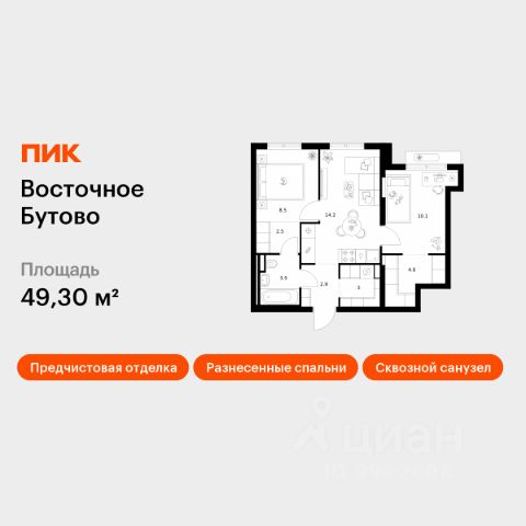 Продаётся 2-комн. квартира площадью 49,3 кв.м на 24 этаже 25 этажного дома (Корпус 55, Секция 1) проекта ПИК Восточное Бутово. Светлый просторный подъезд на уровне земли, функциональная планировка, большие окна, предчистовая отделка. Жилой квартал "Восточное Бутово" расположен в 5 км от МКАД по Симферопольскому шоссе, в Ленинском районе Московской области. Это экологически благоприятное место по соседству с Бутовским лесопарком. В 25 минутах на машине - станции метро и МЦД "Бутово". В "Восточном Бутово" уже открылись пять детских садов из десяти запланированных и одна школа из четырёх. Внутри квартала будет две поликлиники, одна из которых уже работает. В проекте два пешеходных бульвара - по одному из них уже можно гулять и кататься на велосипеде. В закрытых дворах-парках не будет автомобилей - мы построим многоуровневый паркинг, чтобы сделать район ещё более комфортным и безопасным для жителей. Артикул 1044337 (Застройщик ООО "Лотан")