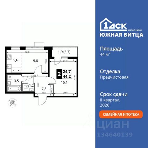 Прямая продажа от застройщика! Семейный жилой район класса Комфорт Плюс Продаётся 2-к квартира номер 66 общей площадью 44.4 кв.м. на 11-м этаже 22 этажного здания. Отделка Whitebox. Особенности квартиры: - Линейная планировка - максимальная функциональность и удобство. - Увеличенное количество окон - дополнительное освещение и свежий воздух. - Гостевой санузел - комфорт и удобство для ваших гостей. - Раздельный санузел - больше удобства для всех членов семьи. - Евроформат - просторное и удобное жилье с отличной планировкой. - Ниша под шкаф - компактное и удобное место для вещей. - Лоджия - уютное место для отдыха и тишины. Квартира с предчистовой отделкой (White box). Вам не придется заниматься черновыми и трудоёмкими работы, а чистовую отделку и дизайн - сделайте на свой вкус. Информация о комплексе: Сочетание свободного перемещения по внутреннней территории без машин и ощущения абсолютной безопасности благодаря надежным ограждениям - вот что отличает ЖК Южная Битца. На территории комплекса созданы все условия как для активного образа жизни, так и для спокойного времяпрепровождения. Свободно перемещайтесь по внутренней территории в безбарьерной среде! Продуманное зонирование во дворах позволяет отделить тихие зоны для родителей со спящими младенцами и тех, кто хочет почитать на свежем воздухе, от шумных игровых зон. Игровые зоны учитывают возраст детей. Площадки для детей старшего возраста вынесены за пределы дворов. Ощущение уютного дома должно начинаться с подъезда. Мы постарались предусмотреть все нюансы, чтобы наши лифты отвечали самым строгим современным требованиям. А наличие кладовых позволит вам поддерживать идеальный порядок и уют в вашей квартире! Транспортная доступность: В 3 км от МКАД в нескольких минутах езды до трех станций метро: Аннино, Бульвар Дмитрия Донского, улица Старокочаловская и станции МЦД2 - жд Бутово. Внутренняя инфраструктура: Для жителей жилого района "Южная Битца" доступна развитая инфраструктура близлежащих московских районов Чертаново, Южное, Бирюлёво Западное, Северное Бутово и Южное Бутово. Множество образовательных учреждений, объекты здравоохранения, торговые и развлекательные центры, кинотеатры, кафе, рестораны, парки.
