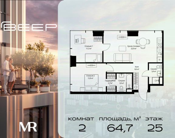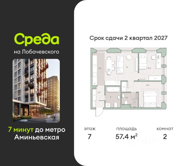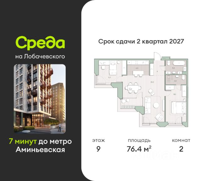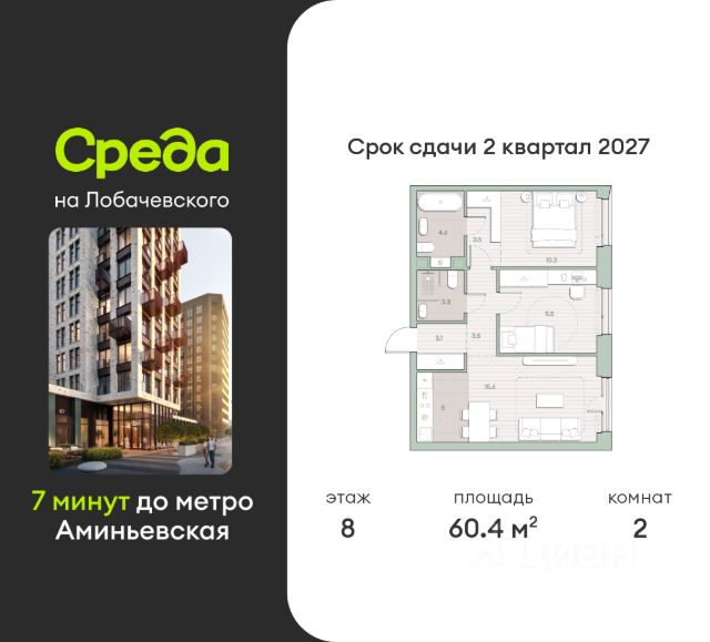 О квартире Продаётся 2-комнатная квартира общей площадью 60.5 кв.м. с отделкой white box. Квартира расположена на 3 этаже корпуса 5.4 в жилом комплексе бизнес-класса "Среда на Лобачевского" в пешей доступности от метро "Аминьевская". О жилом комплексе "Среда на Лобачевского" полностью соответствует критериям современного жилого пространства. Взяв за основу рациональный подход, мы гармонично соединили дизайн, актуальные тренды и функциональность. Продуманный современный экстерьер и функциональные планировки внутри, приватные пространства и разнообразные досуговые зоны для каждого члена семьи — все это "Среда на Лобачевского". Инфраструктура Район отлично развит и наполнен жизнью, здесь уже есть вся необходимая инфраструктура — детские сады, школы, медучреждения, торговые центры, благоустроены парки для прогулок и отдыха, удобен и легкодоступен городской транспорт. Рядом расположены учебные корпуса крупных университетов — МГУ, МГИМО и РАНХиГС. Школы и детские сады в районе занимают высокие позиции в городских рейтингах, поэтому вам не придется беспокоиться о качестве образования детей. Как и об отдыхе: поблизости расположены живописные пруды, реки и парки. Это Парк Олимпийской деревни, Парк имени 50-летия Октября, Мещерский парк и Очаковские пруды. Теперь поставить галочки в еженедельном чек-листе "спорт-прогулки-встречи с друзьями" можно, не покидая любимый район. Особенности Особое внимание в проекте уделяется созданию функциональных пространств не только внутри дома, но и за его пределами. В ландшафтном парке "Среды на Лобачевского" расположены крытые зоны для спокойного времяпровождения, места для активного отдыха и спорта, коворкинг, соседский комьюнити-центр, водные объекты. —Ландшафтный парк во дворе. —Водный сад с зонами отдыха. —Зоны коворкинга. —Дизайнерские гранд-лобби. —Бесключевой доступ. —Подземный паркинг.
