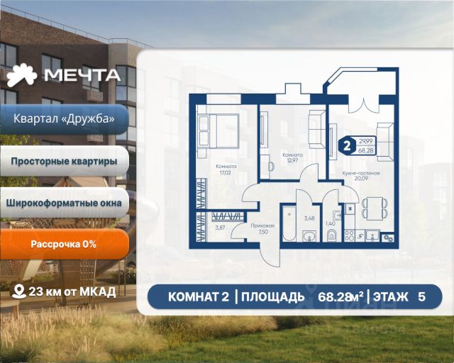 Рассрочка 0% от застройщика! Продается двухкомнатная квартира в квартале "Дружба" жилого комплекса "Мечта". Общая площадь квартиры: 68.28 кв. м, этаж 5 из 5. Срок сдачи: 2 квартал 2026 г. Отделка: Получистовая ОСОБЕННОСТИ: - Просторная кухня-гостиная - Застекленная лоджия - Широкоформатные окна - Гардероб - 2 спальни - 2 санузла - Высота потолка: 2.7 метра Квартал "Дружба" состоит из пяти пятиэтажных домов с несколькими подъездами. Каждый дом оборудован широкими окнами, которые обеспечивают максимальный доступ естественного света и открывают прекрасный вид на окружающую природу. Квартал отличается большими застеклёнными лоджиями, которые позволяют наслаждаться свежим воздухом и красивым видом, не покидая своего жилища. Жилой комплекс "Мечта" расположен в 23 км от МКАД по Дмитровскому или Ленинградскому шоссе. ТРАНСПОРТНАЯ ДОСТУПНОСТЬ: - 15-20 минут на общественном транспорте до МЦД-1 "Лобня" - 30-35 минут на общественном транспорте до метро "Физтех" - 45-50 минут до станций метро "Савеловская" или "Белорусская" - 30 минут на автомобиле до Москвы Инфраструктура включает в себя муниципальную школу и детские сады, кабинет врача общей практики, множество кафе и ресторанов, а также различные спортивные и детские площадки. В пешей доступности от жилого комплекса расположены лес и три реликтовых озера — Долгое, Круглое и Нерское, а также реки Альба, Уча и Волгуша. Территория жилого комплекса закрыта для посторонних, находится под охраной и патрулируется. На въезде расположен КПП. Камеры видеонаблюдения работают круглосуточно на всей территории. Вы и ваши дети будете чувствовать себя в безопасности.
