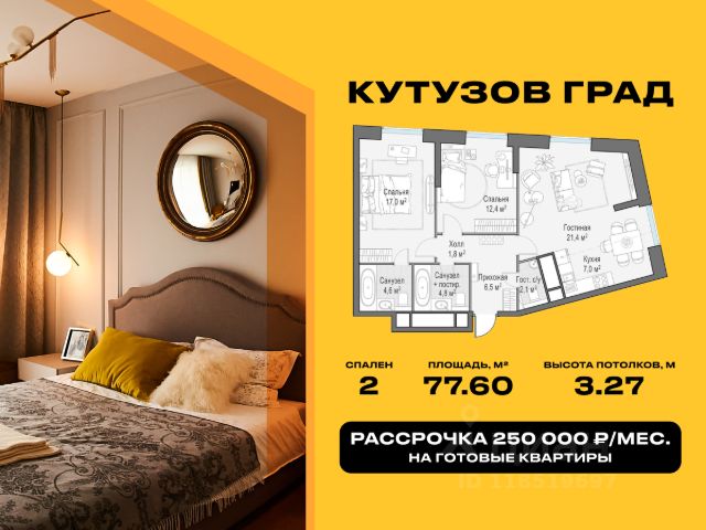 О квартире Продаётся двухкомнатная квартира общей площадью 64.99 кв. м. с отделкой White Box. Квартира на 3 этаже корпуса 4.1 в жилом комплексе бизнес-класса "Среда на Кутузовском". До метро "Кунцевская" 10 минут пешком. Исторический зелёный район "Среда на Кутузовском" строится в Кунцево - историческом и экологически чистом районе Москвы. Здесь нет крупных производств, много лесных массивов и роза ветров, которая обеспечивает приток чистого воздуха. Район наполнен жизнью и уже развит: много детских садов и школ, поликлиники, магазины, кафе, спортивные объекты, парки. - 10 минут пешком до станции метро "Кунцевская". - 5-8 минут на машине до Кутузовского проспекта и Можайского шоссе и 10-15 минут до Рублёвского и МКАД. - 15 минут езды до Крылатских холмов, Суворовского парка и заказника "Долина реки Сетунь". О жилом комплексе "Среда на Кутузовском" - новый квартал с башнями от 12 до 44 этажей, окружённый лесными массивами и историческими усадьбами старой Москвы. Во внутреннем дворе есть водоём, многоуровневые зоны с детскими и спортивными площадками, коворкинг на свежем воздухе и локации для уединённого отдыха. Особенности - Архитектура с многослойными фасадами. - Квартиры с террасами и мастер-спальнями. - Окна в пол на всех этажах. - Общественные лаунж-гостиные. - Собственный ландшафтный парк во дворе. - Зоны барбекю и площадки для отдыха у воды. - Умный подземный паркинг. - Стрит-ритейл на первых этажах.