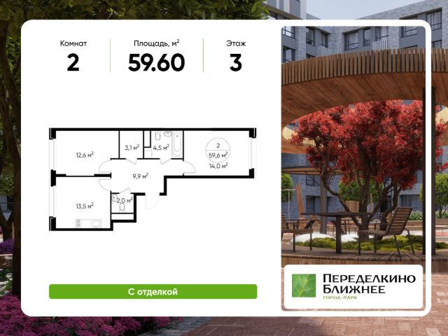 Продается двухкомнатная квартира с отделкой в 18 фазе города-парка "Переделкино Ближнее". Общая площадь квартиры - 54,3 кв. м, этаж 2 из 17. Срок сдачи - 2 квартал 2027 года. Тип дома - монолитный. Новый корпус состоит из 12 секций c переменной этажностью 8-17 этажей: Все секции с отделкой White Box с возможностью повышения за дополнительную плату до дизайнерской отделки: Classic или Smart+ Город-парк "Переделкино Ближнее" расположен в 8 км от МКАД по Боровскому шоссе. ТРАНСПОРТНАЯ ДОСТУПНОСТЬ: - 10 минут пешком до МЦД-4 "Мичуринец" - 14 минут на машине до станции метро "Филатов Луг" Сокольнической линии - 15 минут пешком до станции метро "Рассказовка" Солнцевской линии - 30 минут до центра Москвы - Прямой выезд на дорогу Солнцево-Бутово-Варшавское шоссе, минуя жилую застройку всего ЖК РАЗВИТАЯ СОЦИАЛЬНАЯ ИНФРАСТРУКТУРА: - 7 детских садов, 3 школы - детская музыкальная школа имени Б.Л. Пастернака - поликлиника для взрослых ГБУЗ ГП 212 ДЗМ филиал 70 - пожарная часть 66. Аварийно-спасательный отряд 6 ГКУ - банки, продуктовые магазины, аптеки, фитнес центры, салоны красоты и пр БЛАГОУСТРОЙСТВО: - дворы без машин - игровые зоны и развивающие детские площадки - детские площадки разделены по возрастным группам - зоны для пассивного отдыха - зоны для занятий спорта ОСОБЕННОСТИ АРХИТЕКТУРЫ: - переменная этажность открывает видовые характеристики на реку Алешинка и на лесопарковую зону - увеличенное остекление в квартирах - высокие потолки от 3,03 м. - безбарьерные входные группы - колясочные в каждой входной группе - кладовые помещения расположены на -1 этаже каждой секции и на 2-17 жилых этажах в секции 11 - коммерческие помещения на 1 этаже в 11 и 12 секциях - в секциях 2-4, 6-7, 11-12 по 2 лифта: 1 пассажирский, 1 грузовой - в секциях 1, 5, 8-10: 1 грузовой лифт - мусоропроводы в домах не предусмотрены, запроектированы специальные зона для сбора мусора - на фасаде предусмотрены корзины для установки кондиционеров. - видеонаблюдение установленное в холлах первых этажей, у подъездов и прилегающей территории АВТОРСКИЙ ДИЗАЙН: Входные группы выполнены по авторскому дизайну, оснащены системой "тёплый пол". В каждой входной группе будет располагаться комфортабельная зона ожидания, почтовые ящики, колясочная, акцентные пуфы и столик.