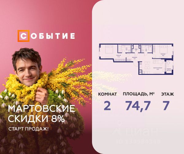 Весь март - скидка до 8% действует до 31.03.2026 г. при 100% оплате и не субсидированной ипотеке! В продаже 2-к квартира от застройщика. Общая площадь 60.7, жилая 41.5, кухня 19.2. Квартира расположена на 5 этаже жилого квартала "Событие-6", корпус 1, Секция 2. Квартира с чистовой отделкой. Срок сдачи: 4 кв. 2029 года. СОБЫТИЕ.6 — финальный дом парк-квартала СОБЫТИЕ на Мосфильмовской. Переезжайте в уже сформированный квартал с готовой инфраструктурой и парком! Премиальный жилой комплекс в престижном районе Москвы предлагает стильную архитектуру, продуманное благоустройство и великолепно разнообразие общественных пространств. Свой парк прямо возле дома! Архитектура Архитектура СОБЫТИЯ.6 выполнена в ультрасовременном стиле московским бюро Atrium на основе дизайн-кода британских архитекторов LDA Design и UHA London. Дом отличает оригинальная геометрия фасадов, большое остекление и высокие лобби (до 6,2 м) с авторской мебелью и светильниками. Расположение Мосфильмовская улица (Раменки) — один из престижных районов Москвы. Близость к историческому и деловому центру, природным зонам Запада столицы. Транспортная доступность: • 10 мин до Москва-Сити и ТТК; • 15 мин до Садового кольца; • 25 мин до аэропорта Внуково; • 7-10 мин до станций метро "Аминьевская" и "Мичуринский проспект". Инфраструктура: • парк "Событие" (12 га, финалист конкурса Правительства Москвы) с беговыми (1,5 км) и велодорожками (2,7 км), экотропой (1,6 км), площадками, лекторием; • школа, детский сад, магазины, салоны красоты, рестораны (к моменту заселения); • мультидвор с игровыми и спортивными площадками, мини-бульваром; • общественная терраса на 10-м этаже (коворкинг, лаунж); • Закрытые общественные пространства: детская комната, спортивный зал, коворкинг, лаунж-зоны. Паркинг 256 мест для жителей (48 — для электромобилей), 24 гостевых (5 — для электромобилей), мойки колес, кладовые, зоны для велосипедов. Окружение Парки и заповедники (Воробьёвы горы, Матвеевский лес и др.), МГУ, театр им. Н. И. Сац, стадион "Лужники". Безопасность Видеонаблюдение, контроль доступа, видеодомофоны, консьерж-сервис 24/7, системы пожарной безопасности и мультисервисная оптическая сеть.