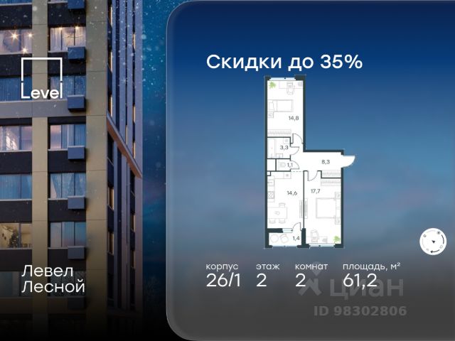 Цена указана с учётом скидки при 100%-й оплате, несубсидированной ипотеке, рассрочке (кроме программы "Рассрочка 0%"). В районе, утопающем в густой зелени лесов, многочисленных парков и скверов, продаётся 2-комнатная квартира площадью 56.40 кв.м с отделкой white box. Квартира расположена на 15 этаже в жилом комплексе комфорт-класса Левел Лесной (компания Level Group/Левел групп). Жилой квартал Левел Лесной расположен в посёлке Отрадное Красногорского района Московской области. Это уникальный природный уголок вблизи района Митино. Посёлок окружён обширными лесными массивами. Обилие зелени создаёт благоприятный экологический фон и превращает этот район в оазис спокойствия и единения с природой. Расположение и инфраструктура: - Район окружен роскошной зеленью лесов и парковых зон, занимающих территорию свыше 1 000 гектаров, среди них лесопарк внутри жилого комплекса, загородный парк "Отрада", Митинский лесопарк, набережная реки Синички. - Идеальные условия для активного отдыха в любое время года: пешие и велопрогулки, бег, зимой - лыжи и катание на ватрушках. - На территории ЖК - частная школа "Светлые Горы", входящая в топ лучших школ Москвы и Подмосковья (Forbes Education, 2023), и детский сад, в пешей доступности расположены 9 детских садов. - На территории жилого комплекса - сетевые супермаркеты, локальные магазины, аптеки, салоны красоты, рестораны и другие объекты инфраструктуры в сданных корпусах. В 12 мин. пешком - крупный торговый парк "Отрада" с гипермаркетами, кинотеатром и детскими развлечениями. Отличная транспортная доступность: - 25 мин. пешком до станции метро "Пятницкое шоссе"; - 28 мин. на автобусе до станции метро и МЦД-2 "Волоколамская"; - 11 мин. на авто до МКАД; - 25 мин. на авто до ТТК. Продуманный архитектурный проект: - Концепция проекта Левел Лесной разработана бюро СПИЧ; - Высотность комплекса до 15 этажей с уникальными видами на лесные массивы и город; - Высота потолков до 3 м; - Современные окна высотой до 1,6 м, в части квартир предусмотрены окна в пол. Высота подоконников 0,6 м. Благоустройство: Продуманное пространство и аура приватного европейского городка рождают чувство лёгкости и расслабления у каждого, кто попадает на территорию проекта. Концепцию общественных площадок разработали в партнёрстве два архитектурных бюро: Highlight Architecture и SCAPE. В безопасных дворах без машин каждый обязательно найдёт себе место для вдохновения, отдыха и спорта. Купить 2-комнатную квартиру в новостройке с отделкой рядом с метро Митино.