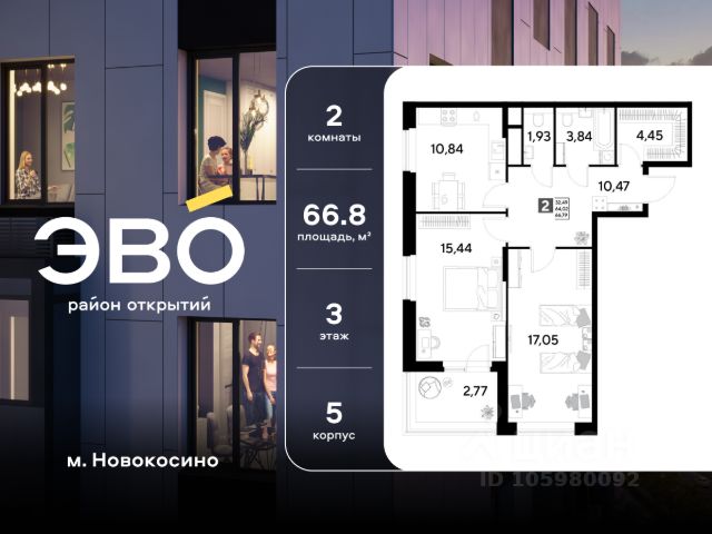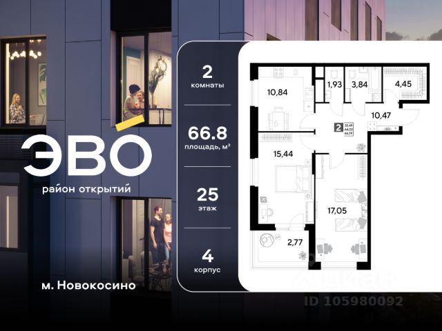 Продается двухкомнатная квартира 65.35 кв.м. в жилом комплексе ЭВО на 6 этаже по адресу: Московская область, г. Реутов, ул. Комсомольская. Скидка 10% при полной оплате!* ЭВО - проект комфорт-класса от девелопера Dogma. Каждый житель сможет открыть для себя максимум возможностей. Совершенствоваться во всех направлениях: физическом, эмоциональном и материальном. В ЭВО можно открыть для себя новые виды спорта, найти единомышленников по хобби, партнеров по бизнесу, развивать в детях новые грани, наслаждаться природой и лаконичной архитектурой. Более 6 га благоустройства в первой очереди! - Зеленый двор без машин, кленовая аллея для прогулок. - Нейродинамические площадки для детей разных возрастов. - Зона уличных тренажеров, столы для пинг-понга, места для занятия йогой. велодорожки и дорожки для скандинавской ходьбы. - Детский сад на 180 мест и школа на 750 мест. - Зона книгообмена - Лобби с зоной ожидания, колясочной и лапомойкой. - Магазины и кафе на первых этажах. БЕЗОПАСНОСТЬ - Закрытая территория. - Круглосуточное видеонаблюдение. - Контроль доступа. РАСПОЛОЖЕНИЕ Пешком - 7 минут до станции Реутов. - 20 минут до метро Новокосино. На машине - 4 минуты до МКАД. - 6 минут до шоссе Энтузиастов. - 9 минут до Носовихинское шоссе. - 13 минут до МСД (Московский скоростной диаметр). СОЦИАЛЬНАЯ ИНФРАСТРУКТУРА В первой очереди предусмотрено строительство детского сада на 180 мест и школы на 750 учащихся. В 10 минутах ходьбы от ЭВО находится детский технопарк "Изобретариум", в котором более 60 научных секции: от IT до промышленного дизайна. Для творческих ребят рядом есть художественная и музыкальные школы, хоровая студия. ОКРУЖЕНИЕ - Реутовский центральный парк, Александровский сквер, Фабричный пруд. - ТЦ "Экватор", ТК "Шоколад". - Спортивный комплекс "Старт", Ледовый комплекс "Реутов Арена". - Музей-усадьба "Кусково". *Подробности уточняйте по телефону. Купить 2-комнатную квартиру в новостройке с отделкой рядом с метро Новокосино.