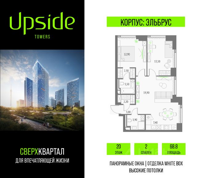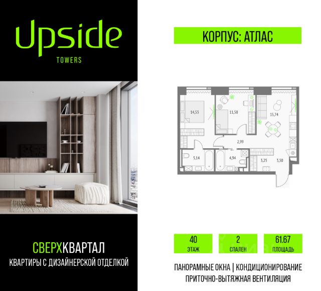 Продаётся 2-комнатная квартира площадью 57.16 кв.м на 9 этаже 19 этажного корпуса Олимп в квартале небоскребов "Upside Towers". В квартире отделка White-box, c видом на корпус Эльбрус, Бизнес-парк Останкино, прогулочный бульвар, детский сад, школу, Останкинскую башню. Номер квартиры В0904. Upside Towers - технологичный квартал строится в динамично развивающемся Бутырском районе, в 3 мин. от метро, в 5 мин. от ТТК. На территории 7 га возводится 5 высотных башен от 19 до 58 этажей, названных в честь главных вершин земли. Квартиры с панорамными окнами в пол, высокими потолками и современными инженерными решениями. Благоустроенная зеленая территория включает: приватные дворы, природный комплекс, прогулочный бульвар, ландшафтный парк 2,5 га с сенсорным садом и многофункциональными игровыми и спортивными площадками. В корпусе откроются магазины, кафе и рестораны, а также другие объекты коммерческой инфраструктуры. Большое внимание в проекте уделяется созданию социальной инфраструктуры. Между "Атласом" и "Олимпом" в трехэтажном стилобате разместится уникальное пространство закрытый клуб для жителей квартала Upside Club площадью 2 000 кв. м. Здесь разместятся: каминный зал с роялем, многофункциональная детская зона c двухуровневым игровым оборудованием для малышей и дошкольников, плей-рум для подростков, домашний кинотеатр, коворкинг, переговорные и лектории. На 47 этаже башни "Атлас" откроется SKY SPA Relax с расслабляющей атмосферой, джакузи, сауной, залами для релаксации и йоги. Собственники квартир смогут в любое удобное для них время забронировать посещение спа-зоны через смарт-приложение. На крыше стилобата разместится всесезонная BBQ патио-зона с верандой и закрытыми помещениями для приготовления и отдыха. В башнях откроются смотровые террасы для резидентов с панорамными видами на город, парки, Останкинскую башню, ВДНХ, Ботанический сад и Москву-Сити. Покупая квартиру даже самого минимального размера в Upside Towers, вы получаете в пользование 2 000 м² бесплатных общественных пространств. В рамках проекта строится государственная школа и детский сад, разместится более 15 000 кв.м. коммерческой инфраструктуры. Насыщенная социальная инфраструктура формирует множество сценариев для жизни на территории квартала. В Upside Towers применяются лучшие технологии и практики, чтобы обеспечить высшее качество жизни: Воздух, не уступающий по качеству горному, обеспечит приточно-вытяжная вентиляция. Пятиступенчатая очистка воды с сохранением полезных минералов. Центральное кондиционирование. Внутрипольные конвекторы с естественной конвекцией. Современные системы безопасности и мониторинга микроклимата. Высокоскоростной интернет на всей территории, в квартирах и паркинге за счет усиления GSM-связи всех ведущих операторов. Все места в подземном паркинге оборудованы зарядками для электрокаров. Бутырский район непрерывно развивается и готовится стать новым современным деловым районом Москвы. В рамках программы "Индустриальные кварталы" комплексного р