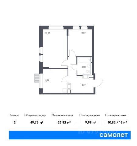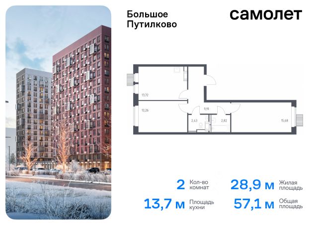 Выгода до 9%. Сдача в 2026 году. Продажа напрямую от застройщика в жилом комплексе комфорт класса "Химки Тайм" площадью 51.34 кв.м на 9 этаже 20 этажного дома.