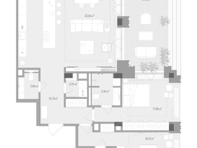 В каждой квартире установлены кухни от итальянского бренда Cesar со встроенной бытовой техникой премиальной линейки Smeg. Кухонный остров, столешница и фартук кухни выполнены из эксклюзивного итальянского мрамора Arabescato Grigio Orobico, одним из лучших видов мрамора на итальянском рынке натуральных отделочных камней.