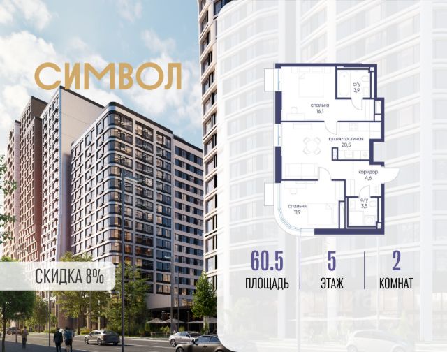 Скидка до 8% действует до 31.03.2026 г. при 100% оплате и не субсидированной ипотеке. Продается 2-комнатная квартира от застройщика: общая площадь 59.00 м², жилая 24.50 м², кухня 21.20 м², 4-й этаж, жилой квартал "Гордость", корпус 40 (секция 1). Срок сдачи: 2 квартал 2029 года. Квартира продаётся с чистовой отделкой и мебелью! Идеальный вариант для тех, кто приобретает недвижимость для сдачи в аренду! Инвестиционный продукт для получения постоянного дохода. Позвоните сейчас и забронируйте квартиру! Квартал бизнес-класса СИМВОЛ - это городское пространство нового поколения в историческом районе Лефортово, на границе ЦАО, в 2 км от Садового кольца. Бионическая архитектура СИМВОЛА превратила Лефортово в суперсовременное и модное пространство. Из окон, с балконов и террас просторных квартир СИМВОЛА открываются отличные виды на город и новый парк "Зеленая река", "протекающий" через все кварталы комплекса на 2 км. В квартале уже есть все, что нужно для комфортной жизни: кафе и рестораны, супермаркеты и магазины, медицинские и физкультурно-оздоровительные центры, салоны красоты и барбершопы, аптеки и оптики, химчистки, пункты доставки и другие сервисы - всего более 90 действующих объектов внутриквартальной инфраструктуры. Для юных жителей СИМВОЛА открыты детский сад и инженерный лицей при МГТУ им. Баумана. Особенности квартала: • Свой парк "Зеленая Река" - 10 га зелени и развлечений на любой вкус! • Уникальная для Москвы архитектура - Проект создан архитектурной мастерской ATRIUM по дизайн-коду британских бюро LDA Design и UHA London. • Богатая инфраструктура с детскими садами и лицеем им. Баумана, кафе и ресторанами, супермаркетами и аптеками, зоной для фитнеса, бассейном и мед. центром. • Квартиры с панорамными окнами, террасами, ванными с окнами и каминами редких форматов. • Закрытые безопасные зелёные дворы-парки без машин!