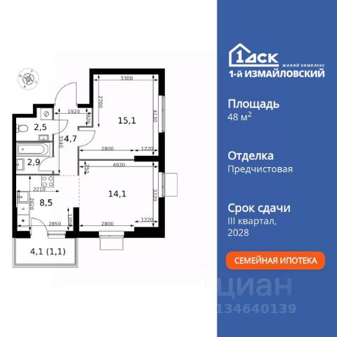 • ИПОТЕКА 10% ДЛЯ ВСЕХ БЕЗ НАЦЕНОК • ДОСТУПНО ПО СЕМЕЙНОЙ ИПОТЕКЕ Прямая продажа от застройщика! Жилой Комплекс Комфорт класса. Продаётся 2-к квартира номер 948 общей площадью 48.9 кв.м. на 8-м этаже 25 этажного здания. Отделка Whitebox. Цена с учётом скидки. Особенности квартиры: - Просторная спальня, в которой можно разместить большую кровать. - Угловая планировка - больше пространства для ваших идей. - Увеличенное количество окон - дополнительное освещение и свежий воздух. - Раздельный санузел - больше удобства для всех членов семьи. - Евроформат - просторное и удобное жилье с отличной планировкой. - Место для игры/занятия спортом - идеальное пространство для активных детей. - Можно оборудовать рабочее место - комфорт для работы и учёбы. - Проходная кухня-гостиная - идеальное пространство для общения и готовки. - Ниша под шкаф - компактное и удобное место для вещей. - Балкон - открытое пространство для отдыха. Квартира с предчистовой отделкой (White box). Вам не придется заниматься черновыми и трудоёмкими работы, а чистовую отделку и дизайн - сделайте на свой вкус. Информация о комплексе: Современный архитектурный проект "1-й Измайловский" - идеальное место для проживания, расположенное в восточной части Москвы в окружении 14 000 гектаров леса. Комплекс пронизан атмосферой здорового образа жизни и благополучия. Сиреневый сад и близлежащие лесопарки - это места, где можно насладиться лыжными прогулками зимой и тонизирующими пробежками летом. Расположенный между Щелковским шоссе и Амурской улицей, "1-й Измайловский" осмысляет себя не столько через близость к городским точкам притяжения, сколько через соседство с зелеными пространствами и спортивными объектами. Он отгорожен от шоссе застройкой первой линии и собственными садами здоровья. В его окнах - изумрудное море парка "Лосиный остров" и густые кроны окрестных дворов. В его графике - занятия спортом и прогулки в Измайлове. Транспортная доступность: Не более 2,5 км до станций метро "Щёлковская" и "Черкизовская" и МЦК "Локомотив". Щёлковское шоссе соединяет квартал с Северо-восточной хордой и МКАД, Центральным автовокзалом и Восточным железнодорожным вокзалом. Две автобусные остановки в паре минут ходьбы и 11 маршрутов общественного транспорта. На автомобиле 3 минуты до СВХ 12 минут до ТТК 15 минут до Садового кольца Внутренняя инфраструктура: Комплекс находится в исторически сложившемся районе Москвы с хорошим качеством и плотностью инфраструктуры. Торговые центры и сетевые магазины -6 детских садов, включая собственный детский сад на 125 мест -3 школы, включая собственную школу -Поликлиники и медицинские центры -Парки и зоны отдыха Расположение архитектурного проекта создает все условия для тех, кто стремится к здоровому образу жизни и для тех, кто уже сделал выбор в его пользу. В ближайшем окружении расположены несколько стадионов и множество спортивных объектов для занятий спортом на любой вкус: от всеми любимого футбола, баскетбола и до к