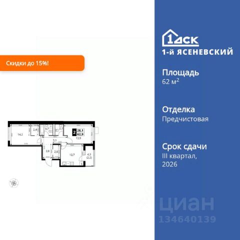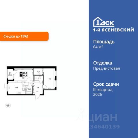 Прямая продажа от застройщика! Жилой Комплекс класса Комфорт Плюс. Продаётся 2-к квартира номер 121 общей площадью 44.2 кв.м. на 14-м этаже 16 этажного здания. Отделка Whitebox. Цена с учётом скидки. Особенности квартиры: - Квартиры рядом с метро - м. Корниловская 9 мин пешком - 63 га лесопарка за окнами - Школа c it-кластером и бассейном. 2 детских сада - Просторная спальня, в которой можно разместить большую кровать. - Распашная планировка - отличное сочетание удобства и свободы. - Увеличенное количество окон - дополнительное освещение и свежий воздух. - Раздельный санузел - больше удобства для всех членов семьи. - Евроформат - просторное и удобное жилье с отличной планировкой. - Возможность добавить спальное место - дополнительный комфорт для гостей. - Лоджия - уютное место для отдыха и тишины. Квартира с предчистовой отделкой (White box). Вам не придется заниматься черновыми и трудоёмкими работы, а чистовую отделку и дизайн - сделайте на свой вкус. Информация о комплексе: В жилом комплексе комфорт-плюс класса "1-го Ясеневского" доступны преимущества двух стилей жизни. Ведь в пешей доступности метро, школа с 25-метровым бассейном и IT-кластером и при этом целых 63 га благоустроенного Троицкого лесопарка под окнами, где так приятно дышать свежим воздухом и слушать пение птиц. Собственная закрытая территория "1-го Ясеневского" представляет собой уютный оазис. Здесь и зеленый освещенный бульвар для прогулок, система велодорожек, маленькая городская площадь, кафе, пекарни и кофе поинты. А еще дворы без машин и многоэтажная парковка. Изюминка территории - фруктовые деревья во дворах и городские сады. "1-й Ясеневский" - всего в 1 км от МКАД, на территории новой Москвы. Жилой комплекс, где есть все необходимое для современного человека. Транспортная доступность: До метро "Корниловская" - 12 минут пешком До метро "Тютчевская" - 25 минут пешком До метро "Теплый стан" - 10 минут на транспорте До метро "Ольховая" - 30 минут на общественном транспорте Личный автотранспорт: Выезд на Калужское шоссе - 500 м МКАД - 1 км Внутренняя инфраструктура: ЖК "1-й Ясеневский" можно назвать идеальным местом для жизни семьи с детьми. Здесь буквально за домом находится Троицкий лесопарк - излюбленное место прогулок молодых родителей. А во внутренних дворах под детские площадки выделены специальные зоны. Они оборудованы всем, что нужно для счастливого детства: современными и максимально безопасными качелями, песочницами и лазалками. Оборудование и игровые сценарии на детских площадках спроектированы вместе с командой детских психологов для правильного развития ребенка и для повышения их интереса. Также рядом с домом два детских садика, один из которых уже построен и школа на 1100 мест. Школу по праву можно назвать образцовым учебным заведением. В ней закладываются основы успешного будущего. Здесь есть класс робототехники, IT-кластер, 25-метровый бассейн и прекрасно оборудованные спортзалы.