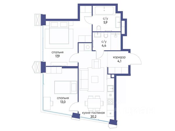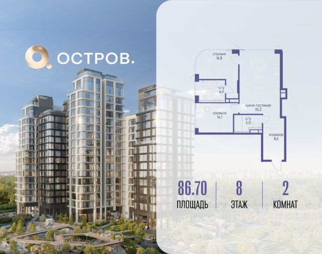 Продаётся двухкомнатная квартира от застройщика: общая площадь 64.20 м², жилая 28.50 м², кухня 23.20 м², 17, жилой квартал "Остров 7", корпус 7 (7 квартал) (секция 1). срок сдачи: 4-кв. 2025. , 2 санузла: 2 совмещенных. В жилой зоне 2 больших окна на одну сторону, хорошая инсоляция. Позвоните сейчас и забронируйте квартиру! Купите квартиру в доме у прибрежного парка, в квартале ОСТРОВ.7. Это семь корпусов премиум- и бизнес-класса в одном из лучших мест ОСТРОВА - между бульваром и парком, поблизости от реки. Стильные корпуса имеют узнаваемый вид благодаря бионической пластике фасадов, приподнятых над землей. Для жителей предусмотрены детский клуб, фитнес-рум, коворкинг, переговорные, лаунжи. На крышах устроены видовые общественные пространства с зонами для отдыха и спорта. Двор расположен на двух уровнях: нижний ландшафтный парк и верхняя городская терраса. ОСТРОВ.7 - часть жилого комплекса на западе Москвы, в 15 минутах езды от центра. Это настоящий заповедник посреди большого города, в окружении реки и 650 га заповедников. Здесь все необходимое находится по соседству: от детского сада до супермаркета, от фитнес-зала до серфинг-центра. На территории созданы все условия для отдыха и общения: клубная инфраструктура в домах и дворы-парки, набережные и променады, маршруты для спортсменов, детей и возрастных жителей. В нескольких минутах ходьбы расположена станция метро "Терехово" БКЛ. На автомобиле - 10 минут до Москва-Сити и 15 минут до Садового кольца.