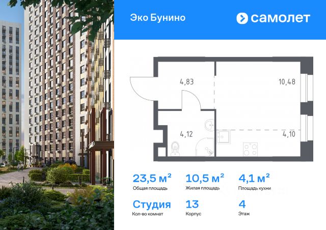 Общая площадь: 32.4 кв.м., жилая: 10.5 кв.м., площадь кухни: 12.4 кв.м. Этаж: 3.