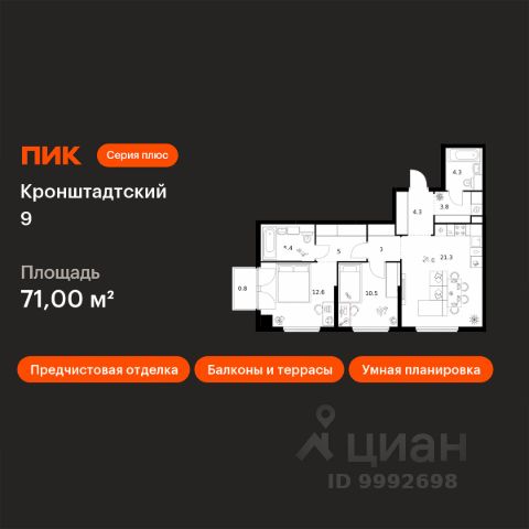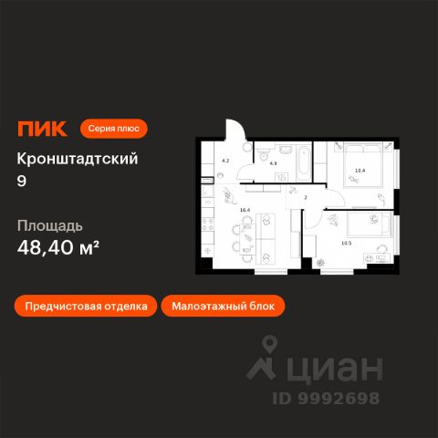Продаётся 2-комн. квартира площадью 53,5 кв.м на 20 этаже 32 этажного дома (Корпус 1.1.3, Секция 3) проекта ПИК Кронштадтский 9. Светлый просторный подъезд на уровне земли, функциональная планировка, большие окна, предчистовая отделка.