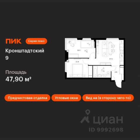 В "Кронштадтском 9" умные планировки: вы сами выбираете, как их использовать, чтобы ваша квартира была максимально комфортной именно для вас. Например, постирочная может стать студией звукозаписи, а зона для гардероба — кабинетом. В новых корпусах есть квартиры с кухней-нишей, сквозным санузлом и мастер-спальней с собственной ванной.