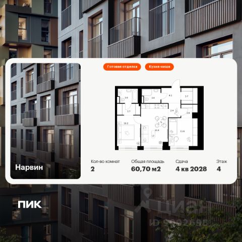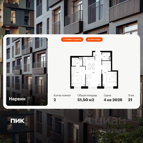 Новостройка! Продается 2-комн. кв-ра площадью 48,9 кв.м, (Корпус 1.2, Секция 2) 8 этаж 19-этажного дома в Нарвин от ПИК. Новый проект ПИК Серии плюс "Нарвин" возводится в Головинском районе Москвы. "Нарвин" — камерный квартал из трёх башен с продуманной архитектурой от российского бюро GAFA. Каждая башня имеет уникальный строгий силуэт, созданный за счёт чередования цветов и форм. В проекте предусмотрены квартиры с готовой отделкой, умными планировками и разнообразными балконами: французские, открытые, закрытые, а также угловые окна и окна в пол с видами на Головинские пруды. А во дворе — благоустроенная территория, которая обязательно станет местом притяжения для жителей. Рядом много мест отдыха, ведь проект возведён в пешей доступности от торговых центров и парков. Шаговая доступность от станции метро "Водный стадион". Рядом просторные парки, магазины и центры развлечений. #d13.11# Артикул 979938 Продам 2-комнатную квартиру в новостройке с отделкой станция Коптево (МЦК).