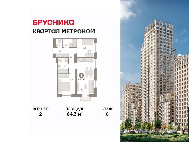 Квартира с кухней-гостиной и двумя спальнями в квартале "Метроном". Особенности планировки: гардеробная, мастер-спальня, окна на две стороны, предчистовая отделка, французский балкон. квартиры в нашей базе: КВМ-КВМ01-7-7.21.1.
