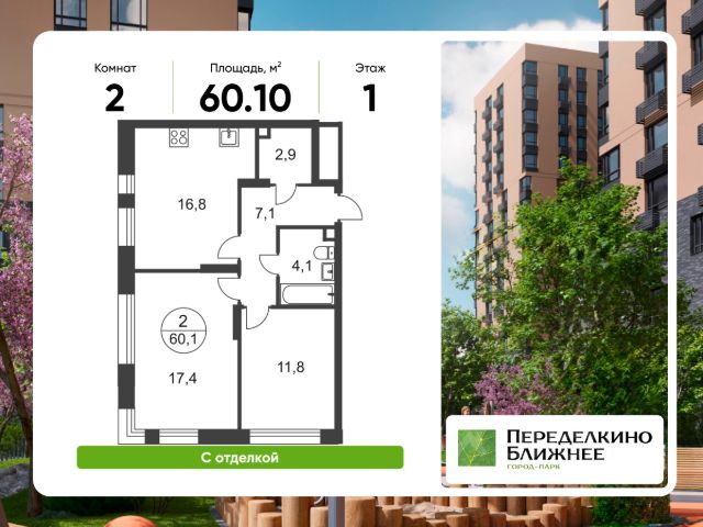 Продается двухкомнатная квартира в городе-парке "Переделкино Ближнее". Общая площадь квартиры - 44,5 кв. м, этаж 6 из 17. Срок сдачи - 3 квартал 2028 года. Тип дома - монолитный. Корпус расположен в 13 фазе строительства и состоит из 6 секций с переменной этажностью 12-17 этажей. Около 13 фазы запланировано строительство многоуровневого паркинга на 300 м/мест. 13 фаза имеет уникальное расположение и находится непосредственно на берегу Федосьинского пруда, который является сердцем города-парка "Переделкино Ближнее". Город-парк "Переделкино Ближнее" расположен в 8 км от МКАД по Боровскому шоссе. ТРАНСПОРТНАЯ ДОСТУПНОСТЬ: - 15 минут пешком до станции МЦД-4 "Мичуринец" - 25 минут пешком до станции метро "Рассказовка" Солнцевской линии - 30 минут до центра Москвы - 2026 г. - открытие трассы Солнцево-Бутово-Варшавское шоссе РАЗВИТАЯ СОЦИАЛЬНАЯ ИНФРАСТРУКТУРА: - 7 детских садов, 3 школы - банки, продуктовые магазины, аптеки, фитнес центры, салоны красоты и пр БЛАГОУСТРОЙСТВО: - дворы без машин - игровые зоны и развивающие детские площадки - зоны для созерцательного и медитативного отдыха - зоны для занятий спортом ОСОБЕННОСТИ АРХИТЕКТУРЫ: - высокие потолки от 3,03 м - безбарьерные входные группы - колясочные в каждой входной группе - кладовые помещения расположены на -1 этаже каждой секции - в каждой секции 2 лифта: 1 пассажирский, 1 грузовой - на фасаде предусмотрены корзины для установки кондиционеров АВТОРСКИЙ ДИЗАЙН: Входные группы выполнены по авторскому дизайну, благодаря панорамному остеклению наполнены естественным светом. В каждой входной группе будет располагаться комфортабельная зона ожидания с возможностью зарядить электронные устройства, почтовые ящики, колясочная, акцентные пуфы и столик. Продам 2-комнатную квартиру в новостройке с отделкой в поселении Внуковское в Москве.