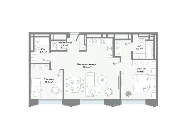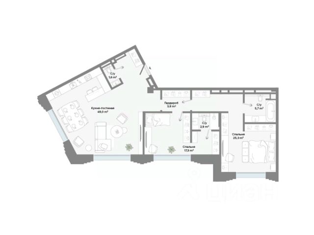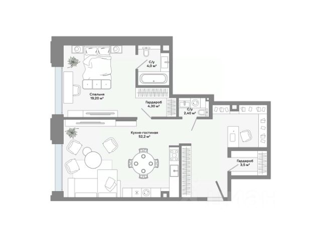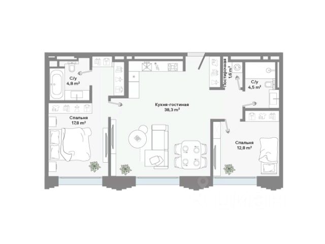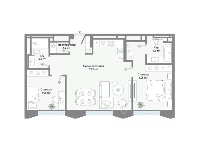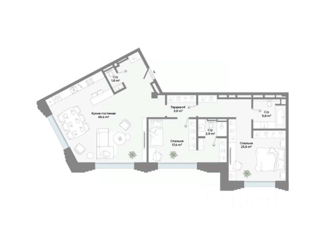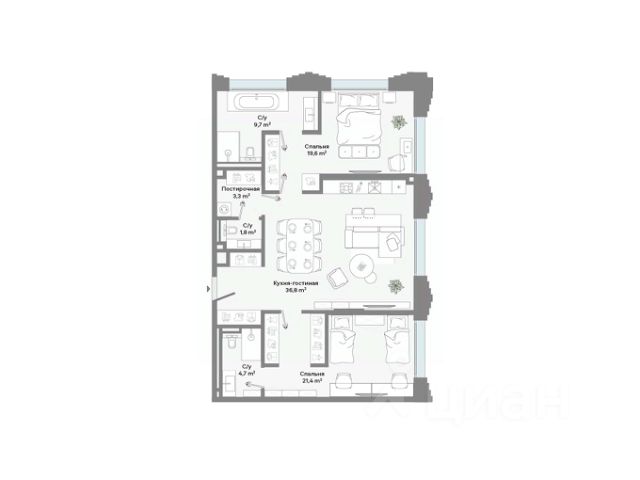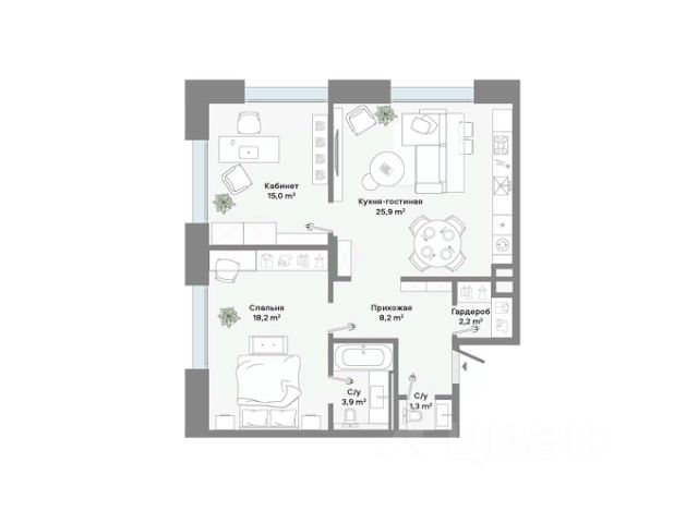 Спланирована гостиная-столовая-кухня с угловым остеклением, спальня со своей гардеробной, ванная комната с ванной и душевой, гостевой с/у