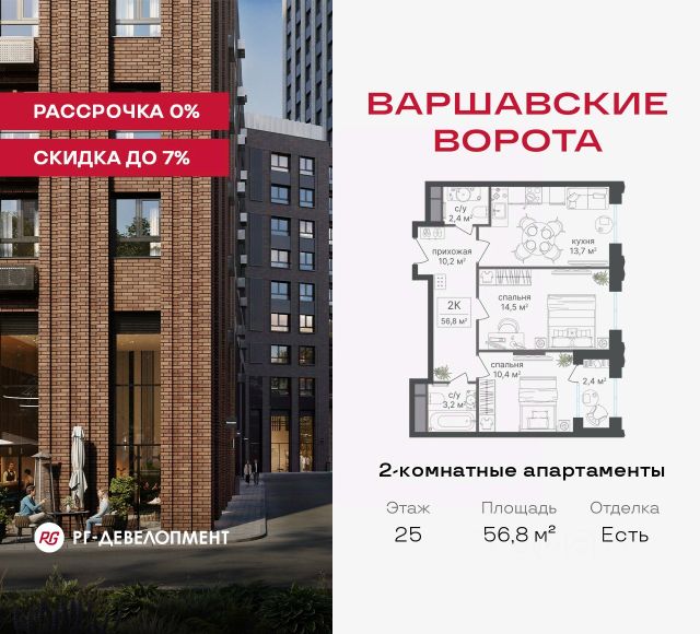 Рассрочка 0% + скидка 5%. Первый платёж 50% при ДДУ, второй 50% — через 12 мес. до ввода ЖК. Продаются 2-комнатные апартаменты 56,9 кв.м. в МФК "Варшавские ворота" на 6-м этаже 9 этажного дома. МФК "Варшавские ворота" — это проект, в котором учтен широкий спектр требований: от транспортной доступности и развитой инфраструктуры до архитектурной выразительности и экологического окружения. Апартаменты в МФК "Варшавские ворота" подойдут для тех, кто ищет продуманное жилье в Москве или готовый инвестиционный актив. Апартаменты здесь — это: - возможность жить комфортно в удобном городском формате — с природой, метро, сервисом и паркингом; - возможность купить лот с готовой отделкой, чтобы вложить минимальные инвестиции в ремонт и получить максимум возможностей от сдачи; - экономия на налоге на имущество, кадастровая стоимость апартаментов ниже ~ на 30% кадастровой стоимости квартиры; - высокая инвестиционная доходность объекта за счет более низкой цены покупки по сравнению с квартирой. Коротко о важном: - 1 минута пешком от м. Аннино; - Удобные выезды на Варшавское шоссе и МКАД; - Вид из окон на Битцевский лес и Аннинский лесопарк; - Высота потолков 2,7 - 3 м; - Закрытый двор-парк; - Школы и детские сады в 10-15 минутах пешком от дома; - Технические лоджии для размещения кондиционеров; - Подземный паркинг; - РГ-Девелопмент — ТОП-20 крупнейших застройщиков России. Проект сочетает в себе современную архитектуру и продуманное благоустройство с уникальным природным окружением. Всего в нескольких минутах от дома — девять парков, каскад прудов и крупнейшие лесопарковые зоны Москвы, создающие ощущение жизни в зеленом оазисе посреди мегаполиса. Архитектурная концепция - стиль Чикаго в Москве. Выполнена в минималистичной эстетике с использованием клинкера и декоративного кирпича. Фасады подчеркивают строгие линии и современный стиль, а входные группы разработаны московским бюро Syntaxis. Лобби оформлены с применением керамогранита, декоративной штукатурки и гипсовых панелей, детали из латуни добавляют изысканности. Пространство оживляют гербарии, композиции из сухоцветов и авторские панно. Проект находится в одной минуте пешком от метро "Аннино", в 12 минутах от станции "Улица Академика Янгеля" и рядом с МЦД-2 "Красный Строитель". Для автомобилистов предусмотрен прямой выезд на Варшавское шоссе и два съезда на МКАД, что позволяет быстро добираться в любую часть города. Среди планировочных решений представлены разнообразные форматы: от функциональных студий до просторных 4-комнатных квартир и апартаментов площадью от 22 до 105 м². Высокие потолки усиливают ощущение простора, а продуманные планировки включают мастер-спальни, гардеробные, угловые окна, объединённые кухни-гостиные и несколько санузлов. Центральное пространство комплекса — закрытый двор без машин. Он разделён на функциональные зоны: детские игровые комплексы, спортивные площадки, воркаут-зоны и уютные места для тихого отдыха. На первых этажах разместя Продам 2-комнатную квартиру в новостройке с отделкой в округе ЮАО в Москве.
