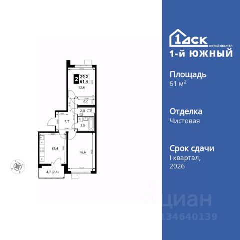 УСПЕЙ ПО СЕМЕЙНОЙ ИПОТЕКЕ БЕЗ НАЦЕНКИ! Квартиры с отделкой от 40 000 рублей в месяц! Прямая продажа от застройщика! Жилой Комплекс класса Комфорт Плюс. Продаётся 2-к квартира номер 954 общей площадью 61.4 кв.м. на 24-м этаже 24 этажного здания. Чистовая отделка. Цена с учётом скидки. Особенности квартиры: - МЦД-5 в пешей доступности - Квартал с южным садом - Свои 3 детских сада и 2 большие школы - Распашная планировка - отличное сочетание удобства и свободы. - Раздельный санузел - больше удобства для всех членов семьи. - Увеличенная высота потолков - ощущение простора и легкости. - Просторная кухня - место для семейных ужинов и кулинарных экспериментов. - Линейная кухня - функциональность и практичность в одном решении. - Гардеробная - удобство для хранения и организации вещей. - Лоджия - уютное место для отдыха и тишины. Информация о комплексе: Одно из преимуществ проектов 1- ДСК большие застекленные лоджии. Другое преимущество честный евро-формат. Во всем проекте предусмотрена система Умный дом. В состав устанавливаемого пакета устройств входит: WiFi реле для управления группами потребителей, беспроводной кран перекрытия с эл. приводом, беспроводной сенсор протечки, Яндекс Станция Мини. Его расположение можно назвать удачным за счет транспортной доступности и близости к природным объектам. По соседству лес, а в каждом дворе плодовые деревья. Весной квартал окутывает бело-розовое облако: это цветут яблони, груши, сливы. К августу в воздух наполняется ароматом созревших плодов. Зимой среди покрытых инеем деревьев протянулась лыжня. Транспортная доступность: - Общественный транспорт: Действующая ж/д станция Булатниково (в перспективе будущая МДЦ D5) в пешей доступности, всего 10-12 минут. - Личный автотранспорт: Удобный выезд на трассу М4-Дон в сторону Москвы и области 850 м, до МКАД - 1 км Внутренняя инфраструктура: Красивые продуманные подъезды - еще одно преимущество проекта 1-й Южный. Вход в сквозные подъезды есть и с улицы, и со двора. Благодаря сплошному остеклению в них всегда светло и уютно. Подъезды расположены на уровне земли, поэтому и молодым родителям с коляской, и жильцам с ограниченными возможностями вход и выход неудобств не доставят. В помещении предусмотрено место под стойку ресепшен с выводом инженерных сетей. Если жильцы решат на общем собрании, что необходим охранник или консьерж, организовать для них рабочее место можно быстро и с минимальными затратами. В подъездах предусмотрены уборные для детей и взрослых. Колясочные в каждом подъезде позволяют поддерживать порядок и чистоту на этажах. На случай прогулки с четвероногим питомцем в непогоду в подъездах устроены лапомойки. Во дворах и на общественных территориях 1-ого Южного столько всего интересного для юных обитателей. Собственные 3 детских сада и 2 больших школы буквально под окнами Изюминка проекта - пешеходный бульвар-дендрарий, он идеален для семейных прогулок. По сторонам прогулочной зоны разместились точки для самых разнообра