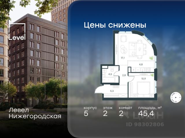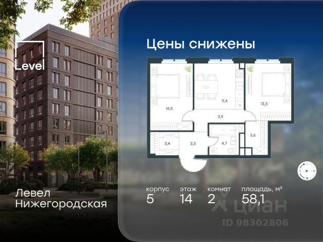 Цена указана с учётом скидки при 100%-й оплате, несубсидированной ипотеке, рассрочке (кроме программы "Рассрочка 0%"). В активно развивающемся районе на юго-востоке столицы продается 2-комнатная квартира площадью 59,1 кв.м c предчистовой отделкой. Квартира расположена на 13 этаже 29-этажного этажного корпуса 5 в жилом комплексе комфорт-класса Левел Нижегородская (компания Level Group/Левел групп). Отличная транспортная доступность - 10 мин. пешком до станции метро, МЦД-4, БКЛ и МЦК "Нижегородская"; - 13 мин. пешком до станций метро "Андроновка" и "Перово"; - 10 мин. на авто до ТТК; - 14 мин. на авто до Садового кольца. Благоустройство Благоустроенная территория комплекса делится на внешнюю и внутреннюю. Внутренняя часть - это закрытый двор 0,9 га, где обустраиваются детские площадки для разных возрастных групп, беседки для отдыха и работы, несколько спортивных зон, включая зоны для уличных тренировок и лужайку для бадминтона. Здесь же появится ухоженный луг с прогулочными маршрутами. Рядом с жилым комплексом будет создан ландшафтный парк площадью 2,4 га. В парке будут высажены высокие деревья, луговые травы и кустарники, благоустроены лаунж-зоны у пруда, дорожки для бега и прогулок. В центре парка предусмотрена событийная площадь, рядом расположатся дополнительные спортивные и детские площадки, а также зона для выгула домашних питомцев. Внутренняя инфраструктура Дома жилого комплекса будут оснащены коммерческими помещениями, где откроются все необходимые сервисы: магазины, аптеки, салоны красоты, кофейни, службы доставки и многое другое. Комфорт - это когда всё рядом. Кроме того, на территории жилого комплекса Левел Нижегородская предусмотрен подземный отапливаемый паркинг. Этап 1 включает 335 машино-мест и 143 кладовых помещения для хранения сезонных вещей. Технологии и безопасность На территории всех общественных зон постоянно ведется видеонаблюдение и предусмотрен высокоскоростной вайфай. Подъезды, паркинг и внутренний двор оснащены системой контроля доступа. Для удобства жителей создано мобильное приложение, позволяющее связаться с управляющей компанией, осуществлять удаленное управление видеодомофоном или просмотреть изображение отдельных видеокамер по заявке. Для безопасного перемещения по этажам и комфортного спуска в паркинг будут установлены современные лифты от компании BLT Brilliant Elevator. Скорость лифтов - 1,6 - 2,5 м/с. Особенности - Архитектура от экспертов из бюро ARCH(E)TYPE; - Разноуровневая застройка - от секций средней этажности до высоток в 45 этажей (этап 1); - Окна шириной до 2,2 метров (этап1) с видами на Останкинскую башню, Измайловский парк, "Москва-Сити" и Кусковский лесопарк; - Лобби с окнами в пол и потолками от 3,4 метров, оснащенные консьерж-сервисом; - Более 35 видов планировок, включая редкие форматы. Артикул 5-140.
