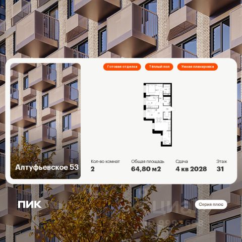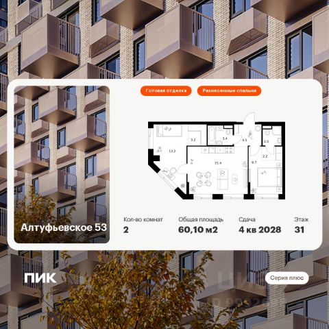 Продаётся 2-комн. квартира площадью 60,1 кв.м на 31 этаже 32 этажного дома (Корпус 1.1, Секция 2) проекта ПИК Алтуфьевское 53. Светлый просторный подъезд на уровне земли, функциональная планировка, большие окна, c отделкой. Проект "Серии плюс" возводится на северо-востоке Москвы. Рядом — удобный выезд на Алтуфьевское шоссе, а оттуда — на ТТК и МКАД, так что до центра Москвы вы доедете на машине примерно за 20 минут. До станции метро "Отрадное" можно доехать на транспорте за 15 минут. За 20 минут получится доехать до станции "Бибирево". Столько же займёт прогулка до станции МЦД "Дегунино". Архитектурную концепцию проекта разработало российское бюро M.A.M. Искусная работа с формой зданий позволила проекту воплотить в себе современную элегантность и функциональность. В проекте представлено множество планировок семейного формата: с мастер-спальнями и комнатами, разнесёнными по разным сторонам квартиры, чтобы у каждого было своё личное пространство. Большие семьи также оценят удобные планировки с постирочными и гардеробными. А также уникальные форматы квартир с террасами, балконами и лоджиями. В проект входят монолитные дома, два детских сада и подземный паркинг. На территории будет городская школа. Во дворах мы построим уютные парки с детскими площадками и местами для отдыха. Здесь вы сможете даже смотреть кино и работать — для этого во дворах-парках будет Wi-Fi. Чуть дальше от домов мы разместим спортивные площадки, чтобы шум от них не мешал жителям. В тихих и быстрых лифтах будут усилители связи, чтобы она не прерывалась и жители продолжали говорить по телефону или проверять соцсети даже перемещаясь между этажами. В окружающем районе есть всё для комфортной жизни: детские сады, школы, торговые центры, парки для прогулок, фитнес-клубы и даже бассейн. Артикул 1004172 (Застройщик ООО СЗ "Перспективные решения")