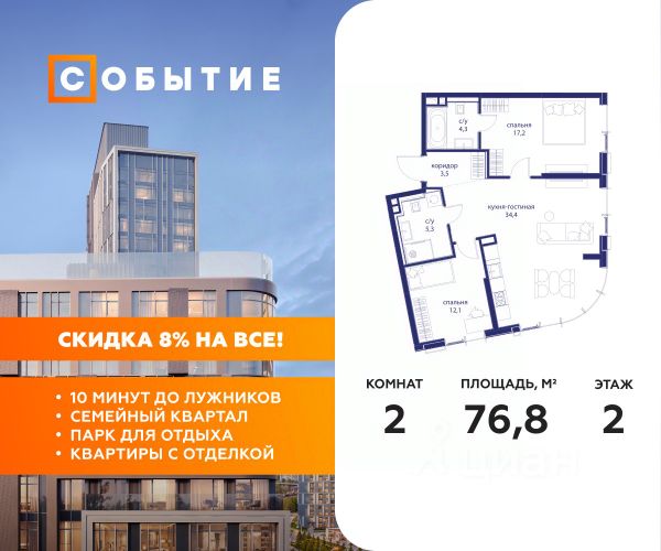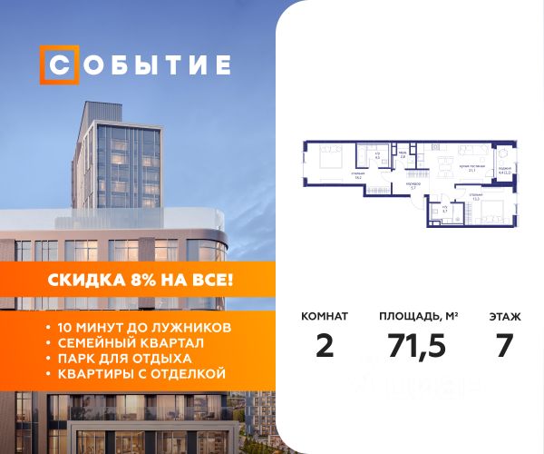 О квартире Продаётся 2-комнатная квартира общей площадью 55.84 кв.м. с отделкой white box. Квартира расположена на 33 этаже корпуса 4.1 в жилом комплексе бизнес-класса "Среда на Кутузовском" в пешей доступности от метро "Кунцевская". О жилом комплексе Комплекс предназначен для людей, которые ставят в приоритет свой комфорт, умеют прислушиваться к себе и понимают, что нужно для внутренней гармонии. Это проект для тех, кто ценит свое время и использует его правильно. Для тех, кто умеет радоваться тому, что есть. "Среда на Кутузовском" — личное место силы и гармонии в двух шагах от центра города. Инфраструктура Жилой комплекс строится в престижном и зеленом Кунцево. Здесь расположены различные торговые центры, престижные учебные заведения (МГУ, РЭУ им. Плеханова, Финансовый университет при Правительстве РФ, РУДН) медицинские клиники. Представлены широкие возможности для поклонников разных видов спорта: от бега в ближайших парках и велозаездов до гребли, баскетбола, футбола, хоккея, фигурного катания и катания на лыжах. На каждый день подойдет World Class с открытым бассейном — он находится всего в 1 минуте от дома. Выбор мест для прогулок также разнообразен: Суворовский парк, лесной массив Крылатских холмов, Москворецкий парк и природный заказник "Долина реки Сетунь". 10 мин пешком: -м. Кунцевская -вся необходимая инфраструктура До 15 мин на авто: -Северо-Западная хорда -Кутузовский проспект -Рублевское шоссе -МКАД -Можайское шоссе Особенности Проект сочетает в себе ритмичность и динамичность, благодаря своей архитектуре, при он этом окружен зеленью и парками. "Среда на Кутузовском" погружает в активный и разнообразный образ жизни, дает вариативные возможности досуга и вдохновляет на новые свершения. —Зоны отдыха у воды —Принцип многослойности в архитектуре —Зона барбекю —Пентхаусы —Умный паркинг —Гайдбук по управлению умным домом —Окна в пол на всех этажах Продам 2-комнатную квартиру с отделкой от застройщика в округе ЗАО в Москве.