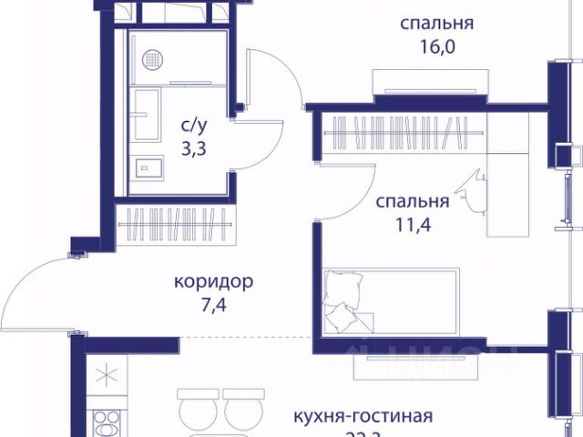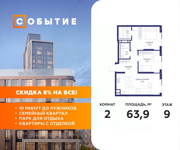 О квартире Продаётся 2-комнатная квартира общей площадью 55.84 кв.м. с отделкой white box. Квартира расположена на 33 этаже корпуса 4.1 в жилом комплексе бизнес-класса "Среда на Кутузовском" в пешей доступности от метро "Кунцевская". О жилом комплексе Комплекс предназначен для людей, которые ставят в приоритет свой комфорт, умеют прислушиваться к себе и понимают, что нужно для внутренней гармонии. Это проект для тех, кто ценит свое время и использует его правильно. Для тех, кто умеет радоваться тому, что есть. "Среда на Кутузовском" — личное место силы и гармонии в двух шагах от центра города. Инфраструктура Жилой комплекс строится в престижном и зеленом Кунцево. Здесь расположены различные торговые центры, престижные учебные заведения (МГУ, РЭУ им. Плеханова, Финансовый университет при Правительстве РФ, РУДН) медицинские клиники. Представлены широкие возможности для поклонников разных видов спорта: от бега в ближайших парках и велозаездов до гребли, баскетбола, футбола, хоккея, фигурного катания и катания на лыжах. На каждый день подойдет World Class с открытым бассейном — он находится всего в 1 минуте от дома. Выбор мест для прогулок также разнообразен: Суворовский парк, лесной массив Крылатских холмов, Москворецкий парк и природный заказник "Долина реки Сетунь". 10 мин пешком: -м. Кунцевская -вся необходимая инфраструктура До 15 мин на авто: -Северо-Западная хорда -Кутузовский проспект -Рублевское шоссе -МКАД -Можайское шоссе Особенности Проект сочетает в себе ритмичность и динамичность, благодаря своей архитектуре, при он этом окружен зеленью и парками. "Среда на Кутузовском" погружает в активный и разнообразный образ жизни, дает вариативные возможности досуга и вдохновляет на новые свершения. —Зоны отдыха у воды —Принцип многослойности в архитектуре —Зона барбекю —Пентхаусы —Умный паркинг —Гайдбук по управлению умным домом —Окна в пол на всех этажах Продам 2-комнатную квартиру с отделкой от застройщика в округе ЗАО в Москве.