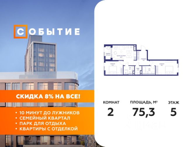 Двухкомнатная велнес-резиденция площадью 64.4 кв. м. на 6 этаже с видом на двор в доме премиум-класса Springs. В квартире выполнена чистовая дизайнерская отделка. Резиденция наполнена светом и воздухом, благодаря панорамному остеклению и высоким потолкам. На первом этаже дома расположены: - фитнес-центр с бассейном; - СПА с хаммамом; - бьюти-зона с массажным кабинетом. - ресторан. Все сервисы доступны исключительно для резидентов. Всего в 2 минутах ходьбы от дома находится заповедный парк Фили прекрасное место для спокойного и активного отдыха. Зеленый массив, набережная, велотропы и открытые зоны для йоги, а также шахматный клуб, летний кинотеатр, множество беседок и кофеен. До делового комплекса Москва-Сити всего 16 минут, а центр — в 14 минутах езды по Кутузовскому проспекту. Удобный выезд к Рублёвскому шоссе — отличная возможность на выходных сбежать с детьми за город, потратив на дорогу меньше получаса. Концепция благоустройства Springs, разработанная студией Wowhaus, воплощает идею взаимного проникновения парка и озеленения внутренней территории: естественная растительность, дополненная акцентами из цветников, плавно вступает во двор. В сочетании с бионической архитектурой дом является органичным продолжением природного ландшафта парка. Продам 2-комнатную квартиру с отделкой от застройщика в округе ЗАО в Москве.