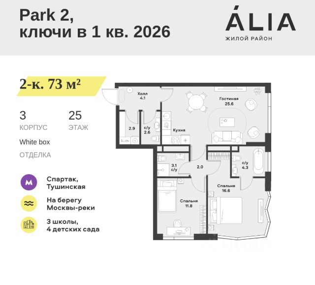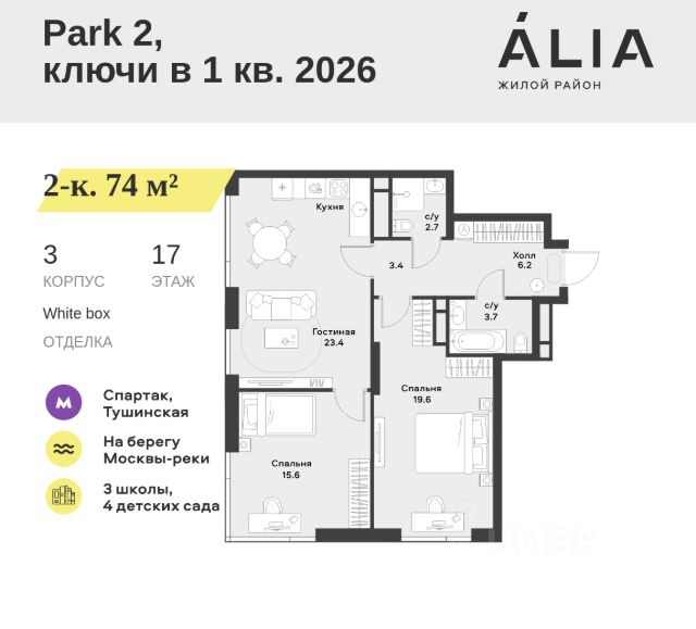 Продаётся 2-комнатная квартира 57 м². В жилом районе ALIA на 2-м этаже 18-этажного дома. Жилой район ALIA — это дома бизнес-класса у слияния Москвы-реки и Сходни. ALIA находится в Покровском-Стрешневе, экологически чистом районе на престижном северо-западе столицы. Район возводится на бывшей территории Тушинского аэрополя, где никогда не было промышленного производства. ALIA — это район разностороннего развития, спроектированный по принципу WORK.LIVE.PLAY.LEARN. Это "15-минутный город", где вся необходимая для комфортной жизни инфраструктура — на расстоянии приятной прогулки. У района удобное расположение: отсюда меньше 10 минут пешком до станций метро "Спартак" и "Тушинская" и всего полчаса на автомобиле до центра города или аэропорта Шереметьево. Архитектурную концепцию ALIA разработало бюро SOM (Skidmore, Owings & Merrill), авторы знаменитой "Бурдж-Халифа". В ALIA больше 140 планировочных решений, среди которых — редкие для Москвы форматы: квартиры с окном в ванной, пентхаус, сити-юниты и таунхаусы. Почти половина территории района отдана под благоустройство. В ALIA три парка: Линейный парк с кафе и магазинами, Центральный парк с амфитеатром, сухим фонтаном и большим плейхабом для детей всех возрастов и Прибрежный парк на собственной набережной, одной из самых длинных в Москве. В каждом урбан-блоке — закрытый внутренний двор с гипоаллергенными растениями и детской площадкой. В лобби каждого жилого корпуса в ALIA оборудована зона ожидания, колясочная, гостевой санузел и лапомойка для домашних животных. За стойкой ресепшена резидентов и их гостей встречает консьерж. Центральное лобби урбан-блока — это стильное общественное пространство с коворкингом, лаундж-зоной и кофе-пойнтом. Это "вторая гостиная" жителей урбан-блока и одно из мест, где формируется комьюнити ALIA. Два ключевых объекта инфраструктуры в ALIA — это спорткомплекс "Чкалов Арена", где представлены 25 видов спорта, и самый большой в стране бизнес-парк класса A, благодаря которому району обеспечено быстрое развитие.