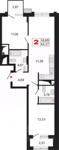 Просторная 2-комн. квартира с отделкой в ЖК "ДНК. Дом на Куйбышева" на 14 этаже. Общая площадь: 58.16 кв.м., жилая: 20.69 кв.м., площадь просторной кухни-столовой: 15.07 кв.м. Комнаты изолированные, все окна выходят на одну сторону. В квартире одна лоджия, два совмещенных санузла. Высота потолков 2.7 м. Квартира находится в корпусе 1. Дом монолитный, одноподъездный, высотой 25 этажей. На этаже 9 квартир. В подъезде 2 пассажирских и 1 грузовой лифт. Окончание строительства - 2 квартал 2026 года. Оформление сделки по договору долевого участия. "Дом на Куйбышева" - это современный городской дом в 10 минутах от центра Екатеринбурга со своим зеленым двором-оазисом. Проект расположен в точке, где одинаково удобно жить в разных сценариях: рядом парк Маяковского, Шарташский рынок, ключевые ВУЗы, школы, а муниципальный детский сад находится в соседнем доме. "Дом на Куйбышева - часть формирующегося квартала, где с каждым днем развивается инфраструктура и усиливается ощущение полноценной городской среды. Здесь одинаково комфортно выстраивать жизнь и семьям с детьми и тем, кто ценит свободу и личное пространство. #2mztti