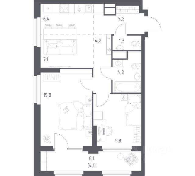 В продаже 2-комнатная квартира в корпусе 15 ЖК 'Эко Бунино'. Квартира располагается на 8 этаже, общая площадь 47.8 м2.