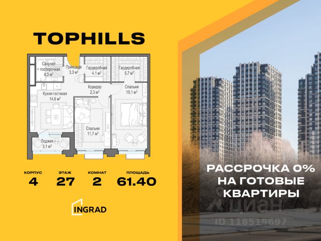 Прямая продажа от застройщика. В жилом квартале, расположенном в Нагорном районе Москвы, продаётся 2-спальная квартира площадью 61.40 кв.м без отделки. Квартира расположена на 27 этаже 27-этажного дома, корпус 4, в жилом квартале бизнес-класса TopHILLS (застройщик ГК Инград). Расположение: Нагорный район - один из наиболее благополучных на юге Москвы. С одной стороны, локация окружена лесопарковой зоной "Долина реки Котловки" и Коробковским садом, с другой - имеет удобную транспортную связь с центром города и доступ к развитой инфраструктуре. Нагорный район Южного округа Москвы не относится к центру города, поэтому здесь менее загруженный автомобильный трафик, позволяющий за 10 минут доехать до ТТК. Для тех, кто предпочитает общественный транспорт - в шаговой доступности станции метро "Нагорная" и "Нагатинская". Отличная транспортная доступность: Даже в часы пик жители квартала возвращаются домой вовремя и не важно, по какому направлению. ТТК в десяти минутах, до метро - рукой подать. Метро Нагорная - 100 метров Метро Нагатинская - 1 км Особенности комплекса и благоустройство: В жилом квартале TopHILLS собственная инфраструктура органично разместилась в стилобате между жилыми корпусами: торговый комплекс, детский развивающий центр, кафе, ресторан домашняя пекарня, супермаркет. Воспользоваться инфраструктурой можно, не снимая тапочек, без выхода на улицу. Стоимость квартиры - 34 340 000 Р. Дом сдан. Более подробную информацию по объекту уточняйте по телефону и в отделе продаж. Продам 2-комнатную квартиру от застройщика Ingrad в Москве.