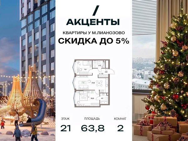 Трехкомнатная евроквартира для большой семьи. -Угловая планировка с видом на 2 стороны -Мастер-спальня с личной ванной и местом для системы хранения -Отдельная уютная детская комната -В квартире предусмотрено классическое остекление с эркерами -Второй санузел для удобства каждого члена семьи -Просторная кухня-гостиная с 3 окнами для семейных торжеств -Отдельная постирочная с местом для хранения инвентаря -Удобная ниша в коридоре для системы хранения Молодой район для жизни "Акценты" в классе бизнес-лайт — точка роста на севере Москвы. Он предлагает элегантные и строгие фасадные решения, авторский ландшафтный дизайн, а также функциональные и доступные по цене планировки. Проект находится в семи минутах пешком от станции метро "Лианозово" и одноименной МЦД-1. Добраться до МКАД можно будет за 10 минут на авто, а дорога до центра займет около 20 минут. Жилой комплекс, расположенный в районе Восточного Дегунино, предлагает развитую инфраструктуру для тех, кто ценит выбор. Он имеет удобный доступ не только к транспорту, но и к паркам, школам, садам, больницам и другим социальным объектам. В пешей доступности находятся 4 поликлиники, 5 школ, 6 детских садов, 3 бассейна и баскетбольная академия. Еще рядом есть несколько лесопарков: "Лианозово" с аттракционами и спортивными площадками для тенниса, волейбола и баскетбола, "Останкино" с конным клубом, прудом и пейнтбол-площадками. А "Северные Дубки" — это завораживающее пространство для прогулок под кронами вековых дубов, берез и лип. Кроме того, в районе не будет скучно и юным жителям. Можно оттачивать трюки в скейтпарке "Союз". Ловким и прыгучим советуем записаться в акробатический центр "Белка".