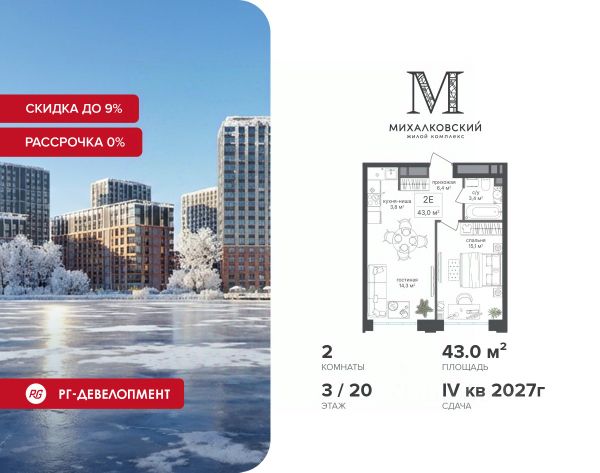 Скидка 9% при покупке квартиры! Цена указана с учетом максимального размера скидки. Идет выдача ключей. Продаётся 2-к квартира 58,1 кв.м. в ЖК "Михалковский" на 2-м этаже 20 этажного дома. Ипотека для каждого! Полная стоимость кредита от 12,378% до 18,537%. Ставка от 0,11% в АО "Альфа-Банк", ген. лицензия ЦБ РФ 1326 от 16.01.2015. Ставка фиксируется на первые 12 месяцев, далее полная стоимость кредита от 22,025% до 24,935% ставка 21,59%. Первоначальный взнос — от 20,1% от стоимости квартиры. Срок кредитования — от 4 до 30 лет. Компания "РГ-Девелопмент" предоставляет скидку на квартиры в жилом комплексе. Акция действительна до 28.02.2026 включительно. Чтобы воспользоваться предложением, необходимо подписать договор на приобретение недвижимости до 28.02.2026 включительно. Рассрочка 0% + Скидка 5% на готовые квартиры. Компания "РГ-Девелопмент" запускает комфортную программу рассрочки на квартиры в построенных корпусах. Предложение распространяется на квартиры со свободной планировкой в построенном корпусе 3. Условия: - Скидка 5% - Первый платеж — от 30% от стоимости объекта. - Оставшаяся сумма выплачивается не позднее 31.03.2026. Действует программа "Растет семья - растет и квартира". Компания "РГ-Девелопмент" вошла в ТОП-10 девелоперов по объёму введённого жилья в "Старой Москве" по итогам 2025 года. Прямая продажа от застройщика! Квартиры без отделки. Срок сдачи корпуса - 3 кв. 2024 г. Особенности проекта: Завораживающие виды Красивое благоустройство Уникальная локация для Москвы (рядом Головинский парк, пруды, усадьба Михалково) Рядом с центром В проекте присутствует: архитектура голландского бюро MLA+, зеленые зоны, транспортная доступность, благоустроенная территория, подземный паркинг, детский сад и выход на Головинский парк с пятью прудами. Название комплекса указывает на одну из его черт - соседство с имением Михалково. Позвольте себе жить в месте, где проводили свой досуг династии Дашковых и Паниных. 2-комнатная квартира от застройщика в районе Головинский в Москве.