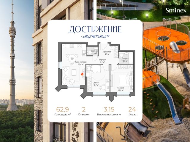 Двуспальная квартира с кухней-гостиной и настоящим дровяным камином. Окна выходят на запад, что позволит наслаждаться закатом и любоваться огнями ночного города. "Достижение" - единственный дом с торжественной архитектурой в окружении бескрайних парков на любой вкус: парк "Дубовая роща", обновленный классический парк "Останкино", самый известный парк России ВДНХ и крупнейший в Европе ботанический сад. Дом находится в непосредственной близости от центра города: до Садового кольца на автомобиле - 15 минут, 700 м до станции метро "Бутырская", а от нее всего 3 станции на метро - и вы на Цветном бульваре. Архитектура проекта - современное прочтение торжественного и изящного стиля ар-деко, который, как и сталинский ампир, сформировался в результате развития идей чикагской школы. В доме 6 секций, 115 вариантов продуманных планировочных решений - от уютных студий до просторных пентхаусов с дровяным камином. В каждой квартире предусмотрен полный комплекс систем комфорта: принудительная центральная вентиляция с фильтрацией воздуха, очистка воды до уровня питьевой, круглогодичное горячее водоснабжение, быстрые бесшумные лифты, которые идут прямо в паркинг, продуманная подготовка под кондиционирование и другие технологические решения. В доме "Достижение" общественные пространства и квартира тоже гармонично дополняют друг друга, как части единого целого. Здесь есть инфраструктурный центр Clubhouse только для жителей, открывающий возможности для общения и детского развития: клубная гостиная жителей по стандарту Friend`s Lab и детская игровая комната 250 кв.м. в концепции Kid`s Lab. На площади 1,7 гектара создан живописный парк с террасным склоном, в котором растут луговые травы, кустарники и деревья. Пространство ландшафтного парка разделено на зоны для активного и спокойного отдыха с зелёными уголками для любителей тишины. Для спокойного отдыха: тихие места с беседками и шезлонгами, клубная гостиная в концепции Friend`s Lab с открытой террасой и гамаками, зона для барбекю, смотровая галерея, уютный пруд, а также пять пеших маршрутов для променада. Для активного отдыха: универсальная многофункциональная спортивная площадка, отдельная зона для занятий workout и бесплатный фитнес-зал только для жителей по стандарту Fit Lab. В центральной части парка расположен амфитеатр со сценой для представлений и проведения мероприятий. Для гармоничного развития маленьких жителей - пространства по стандарту Kid`s Lab для гармоничного развития детей всех возрастов: детская площадка, игровая комната, рельефная площадка для общения со сверстниками, где можно заниматься паркуром, танцевать и играть в настольный теннис.