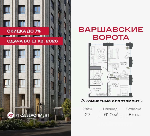 Рассрочка 0% + скидка 5%. Первый взнос 20%, второй — через 6 мес., остаток —до ввода. Продаются 2-комнатные апартаменты 56.8 кв.м. в МФК "Варшавские ворота" на 28-м этаже 30 этажного дома. МФК "Варшавские ворота" — это точка баланса между природой и городом, стилем и функциональностью, жизнью сегодня и устойчивым будущим. Коротко о важном: - 1 минута пешком от м. Аннино; - Удобные выезды на Варшавское шоссе и МКАД; - Высота потолков 2,7 - 3 м; - Закрытый двор-парк; - Школы и детские сады в 10-15 минутах пешком от дома; - Технические лоджии для размещения кондиционеров; - Подземный паркинг; - РГ-Девелопмент — ТОП-20 крупнейших застройщиков Москвы. Проект сочетает в себе современную архитектуру и продуманное благоустройство с уникальным природным окружением. Всего в нескольких минутах от дома — девять парков, каскад прудов и крупнейшие лесопарковые зоны Москвы, создающие ощущение жизни в зеленом оазисе посреди мегаполиса. Архитектурная концепция - стиль Чикаго в Москве. Фасады облицованы вентфасадами под клинкерную плитку. Фасады подчеркивают строгие линии и современный стиль, а входные группы разработаны московским бюро Синтаксис. Вестибюли оформлены с применением керамогранита, декоративной штукатурки и гипсовых панелей, детали из латуни добавляют изысканности. Проект находится в 1 минуте пешком от метро "Аннино", в 12 минутах от станции "Улица Академика Янгеля" и рядом с МЦД-2 "Красный Строитель". Для автомобилистов предусмотрен прямой выезд на Варшавское шоссе и два съезда на МКАД, что позволяет быстро добираться в любую часть города. Среди планировочных решений представлены разнообразные форматы: от функциональных студий до просторных 4-комнатных квартир и апартаментов. Высокие потолки усиливают ощущение простора, а продуманные планировки включают мастер-спальни, гардеробные, объединённые кухни-гостиные и несколько санузлов. Центральное пространство комплекса — закрытый двор без машин. Он разделён на функциональные зоны: детские игровые комплексы, спортивные площадки и уютные места для тихого отдыха. На первых этажах разместятся магазины, кафе и сервисы, что позволит решать повседневные задачи, не покидая территорию комплекса. Для семей с детьми предусмотрен частный детский сад на 50 мест. Подземная парковка и кладовые обеспечат удобство хранения и безопасность автомобилей. Комплекс окружён девятью парками и лесопарками, каждый из которых обладает своей атмосферой. Выйти на пробежку в Аннинском лесопарке, насладиться прогулками по аллеям в Битцевском лесу, спланировать пикник или велопрогулку в Покровском парке, любоваться каскадом Кировоградских прудов. Всего в двух станциях — музей-заповедник "Царицыно" с дворцами, фонтанами и живописными пейзажами. Здесь каждый житель найдёт своё любимое место для отдыха. Южное Чертаново - район развитой инфраструктурой, где сочетаются городские удобства и природное окружение. В шаговой доступности находятся школы, детские сады, спортивные комплексы и торговые цен