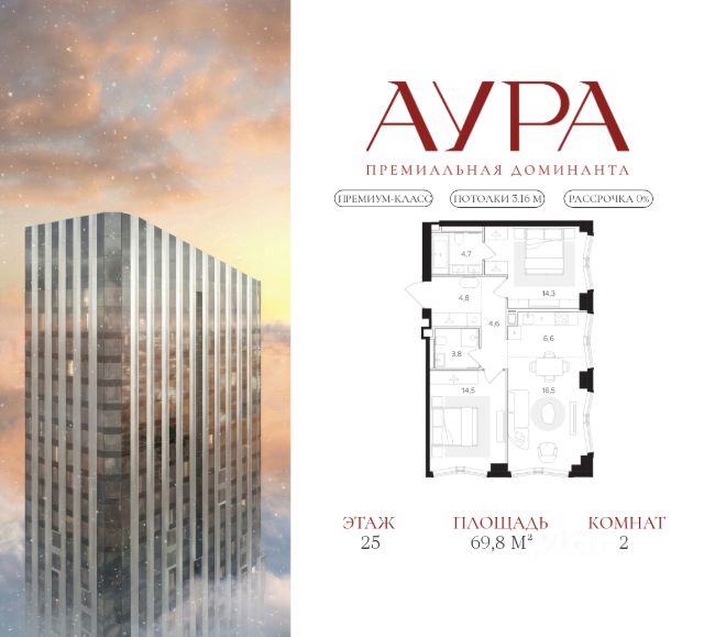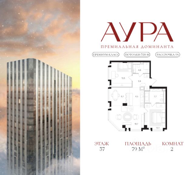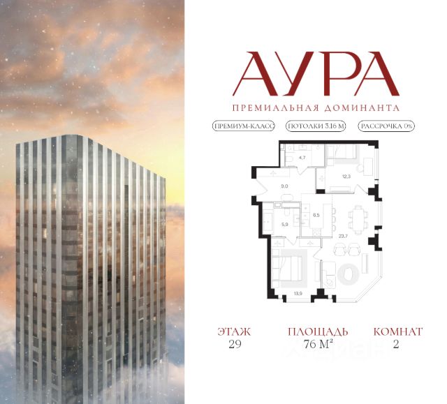 2-комнатная квартира площадью 57,7 м2. Высота потолков 3,16 м. Этаж 38 из 41. О проекте АУРА новая премиальная доминанта Москвы в 10 минутах от Садового кольца. Проект состоит из 42-этажной Бронзовой башни и 41-этажной Серебряной. Рядом набережная Москвы-реки, Даниловский рынок, музеи и галереи, престижные школы и вузы. Двор и благоустройство Приватная территория АУРЫ состоит из нескольких функциональных зон для тихого отдыха, работы и активного времяпровождения на свежем воздухе. На нижнем уровне расположены детские и спортивные площадки, скалодром и крытый павильон для подвижных игр. Выше — амфитеатр для отдыха и вечерних променадов, уличный коворкинг с мебелью и лаунж-зоны с лежаками у воды. На крыше — тихий уголок для занятий йогой, встречи рассветов и наслаждения закатами. По всему двору проложены пешеходные дорожки с подогревом в зимний сезон. Придомовую территорию АУРЫ украсит уникальный для Москвы объект — скала из натурального камня с водопадом, которая станет новой городской достопримечательностью. Эксклюзивная инфраструктура Только для резидентов: • Бьюти-комната • Коворкинг, переговорные и акустические кабинеты • Детская игровая комната • Спортзал и студия для тренировок • Просторные колясочные • Сервисная комната • Лапомойки для домашних питомцев Инфраструктура в составе проекта: • Ресторан авторской кухни • Современная медицинская клиника • Частный детский сад • Бизнес-центр класса "А" • Коммерческие помещения, закрывающие любые потребности — супермаркет, химчистка и др. Атрибуты комфорта • Индивидуальная вентиляция квартир • Вентиляция с очисткой воздуха в общих зонах • Мультизональное центральное кондиционирование (VRF) • Горячая вода круглый год • Вода качества, сопоставимого с питьевой • Усиленная звукоизоляция квартир Входные группы • Гранд-лобби в стиле современной роскоши • Дизайнерские лобби в каждой башне • Панорамное остекление Квартиры Более 40 планировок: от уютных студий до просторных семейных лотов. Всего 916 квартир площадью от 28,1 до 148,8 м². Высота потолков от 3,16 до 6,2 м. Уникальные планировки: • Квартиры с террасами • Квартиры с окном в ванной • Квартиры с круговым остеклением • Двухуровневые пентхаусы Паркинг и келлеры Двухуровневый подземный паркинг на 563 парковочных места: • Постоянные места: 496 (в том числе 48 мест для маломобильных) • Гостевые места: 67 • Персональные кладовые и велостанция • Мойка автомобилей • Станция для подкачки шин • Зарядки для электромобилей • Зона для разгрузки крупногабаритных предметов Интеллектуальные системы • Персональный бесконтактный доступ на территорию и в здание по электронному ключу (Bluetooth/RFID) • Премиальные лифты Mitsubishi • Автоматический въезд на паркинг для резидентов по распознаванию номеров • Круглосуточное видеонаблюдение с возможностью push-уведомлений • Система датчиков для круглосуточного мониторинга • Усиленный сигнал связи — стабильный прием сотовой связи и интернета на всей территории Сервис • Управляющая компания д