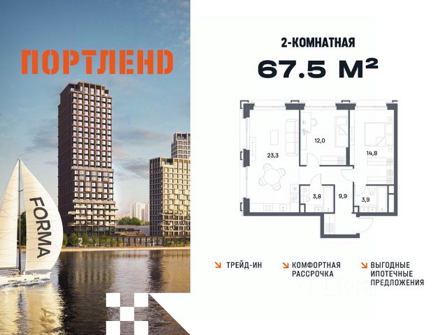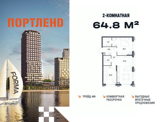 Цены указаны с условием 100% оплаты и стандартной ипотеки. Продаётся 2-к. квартира, 13 этаж в жилом комплексе бизнес-класса ПОРТЛЕНД от девелопера FORMA. ЖК расположен на берегу Москвы-реки в северной части района Печатники в акватории Южного речного порта. Основные преимущества проекта: • Самая протяженная береговая линия реки в Москве 13 км. • Вид на реку в сторону запада панорамные окна на самое широкое водное пространство Москва-реки (900 м) и на закат. • 95% квартир с видом на воду. • К ПОРТЛЕНД не примыкает крупных автомагистралей - отсутствие фонового шума дорог. • В перспективе ближайших 11 лет на территории района запланировано грандиозное преобразование и комплексное развитие. • Собственная набережная длиной 412 м., которая после завершения строительства сомкнется с эко-парком Печатники. • Прямой выход к воде и отсутствие проезжей части между ПОРТЛЕНД и береговой линией. • Инфраструктурное разнообразие: супермаркеты, крупные торговые центры, рестораны, кафе, фитнес-клубы, бьюти-салоны, компании сферы услуг и многое другое. • Собственная школа на 300 мест и детский сад на 275 мест. • Паркинг на 650 м/м • Транспортная вседоступность: метро, авто, велосипед, речной трамвай, канатная дорога • 15 мин. пешком до м. Печатники, 15 мин. на авто до ТТК, 20 минут на авто до Садового кольца