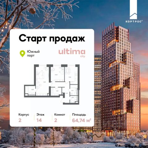Указанная акционная стоимость доступна при 100% оплате или ипотеке без субсидирования. Цена действует до 16.02.2026 23:59:59. Стоимость без акции 28806840. Старт продаж! Продаётся 2-комнатная квартира от застройщика ГК "КОРТРОС" в жилом комплексе бизнес-класса ULTIMAcity. Квартира расположена на 11 этаже 45 этажного корпуса 1. Общая площадь 62,76 м². Без отделки. ULTIMAcity — жилой комплекс бизнес-класса в перспективном районе на юго-востоке Москвы. На его территории появятся 9 башен на 756 этажей, двухуровневый подземный паркинг, собственная инфраструктура, включая детский сад и школу. Всего девелопер благоустроит территорию в 2,6 га. Ближайшая станция метро — "Южный порт". Она откроется в 2028 году и будет находиться в 2-х минутах ходьбы. А прямо напротив расположится остановка водного автобуса-электрохода "Синичка". Дорога от квартала будет удобна и для автомобилистов: - до Кремля — 12 км - до МКАД — 12 км - до выезда на ТТК — 3 км - до Садового кольца — 8 км В двух корпусах первой очереди ULTIMAcity этажностью 45 и 52 реализуется 1 079 квартир с продуманными, рациональными планировочными решениями. В ассортиментной линейке представлены однокомнатные квартиры от 28,2 до 61 кв. м, двухкомнатные лоты от 44,3 до 95,4 кв. м, квартиры с тремя (71 — 115,57 кв. м) и четырьмя спальнями (106,6 — 114,97 кв. м). В экспозиции также есть квартиры с террасами, лоджиями, тремя и четырьмя санузлами, а также с функциональными нишами-кладовыми на кухнях. Запроектированы и эксклюзивные двухуровневые резиденции со вторым светом, в том числе с видом на Москву-реку, площадью от 77,7 до 141,9 кв. м. В рамках проекта запланировано строительство 9 корпусов, школы на 500 учащихся и детского сада на 225 мест. Еще будет создана продуманная инфраструктура для жителей: детские и спортивные площадки, амфитеатр для мероприятий, беседки и теплицы для садоводства, коворкинг, детский клуб и ресторан с открытой террасой. Доступ в жилой комплекс осуществляется по биометрическому контролю - Face ID. Вокруг квартала будет приватная территория с видеонаблюдением и консьерж-сервисом 24/7. Лобби корпусов будут иметь двойные выходы: на улицу и во внутренний закрытый двор.