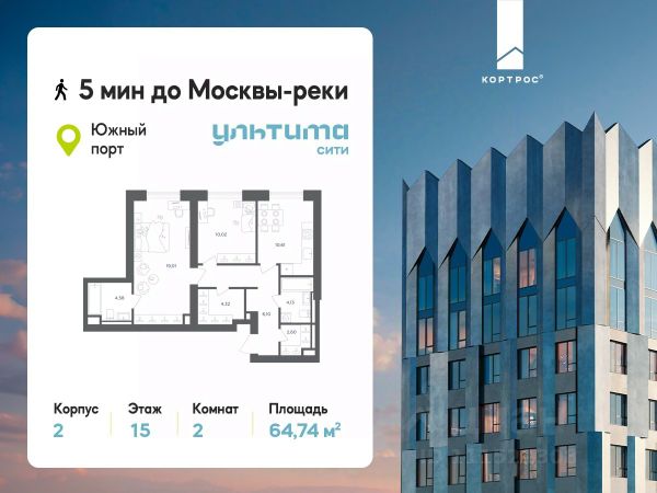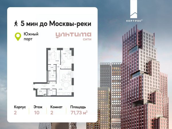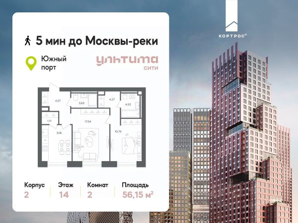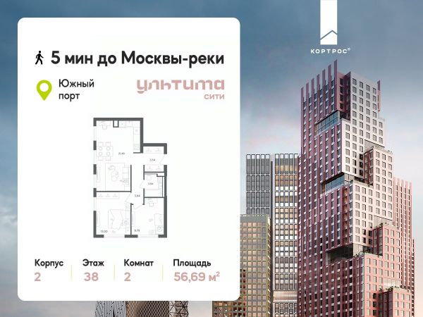 Предложение месяца от застройщика: - Скидка до 10% на ограниченный пул квартир - Рассрочка 0% на 1 год - Семейная ипотека без удорожания, ставка 4% - Ипотека для всех на весь срок, ставка 11,89% Продаётся 2-комнатная квартира от застройщика ГК "КОРТРОС" в жилом комплексе бизнес-класса УЛЬТИМА Сити. Квартира расположена на 7 этаже 52 этажного корпуса 2. Общая площадь 54,85 м². Без отделки. УЛЬТИМА Сити — жилой комплекс бизнес-класса в перспективном районе на юго-востоке Москвы. На его территории появятся 9 башен на 756 этажей, двухуровневый подземный паркинг, собственная инфраструктура, включая детский сад и школу. Всего девелопер благоустроит территорию в 2,6 га. Ближайшая станция метро — "Южный порт". Она откроется в 2028 году и будет находиться в 2-х минутах ходьбы. А прямо напротив расположится остановка водного автобуса-электрохода "Синичка". Дорога от квартала будет удобна и для автомобилистов: - до Кремля — 12 км - до МКАД — 12 км - до выезда на ТТК — 3 км - до Садового кольца — 8 км В двух корпусах первой очереди УЛЬТИМА Сити этажностью 45 и 52 реализуется 1 079 квартир с продуманными, рациональными планировочными решениями. В ассортиментной линейке представлены однокомнатные квартиры от 28,2 до 61 кв. м, двухкомнатные лоты от 44,3 до 95,4 кв. м, квартиры с тремя (71 — 115,57 кв. м) и четырьмя спальнями (106,6 — 114,97 кв. м). В экспозиции также есть квартиры с террасами, лоджиями, тремя и четырьмя санузлами, а также с функциональными нишами-кладовыми на кухнях. Запроектированы и эксклюзивные двухуровневые резиденции со вторым светом, в том числе с видом на Москву-реку, площадью от 77,7 до 141,9 кв. м. В рамках проекта запланировано строительство 9 корпусов, школы на 500 учащихся и детского сада на 225 мест. Еще будет создана продуманная инфраструктура для жителей: детские и спортивные площадки, амфитеатр для мероприятий, беседки и теплицы для садоводства, коворкинг, детский клуб и ресторан с открытой террасой. Доступ в жилой комплекс осуществляется по биометрическому контролю. Вокруг квартала будет приватная территория с видеонаблюдением и консьерж-сервисом 24/7. Лобби корпусов будут иметь двойные выходы: на улицу и во внутренний закрытый двор.